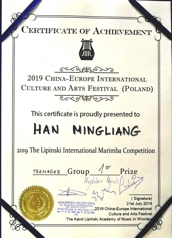 2019年获中欧国际文化艺术节青少年组马林巴一等奖。