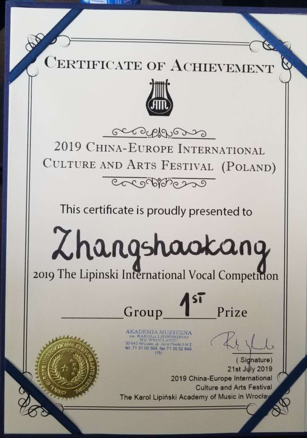 在刚刚落幕的2019中欧国际文化节(波兰)弗罗茨瓦夫.利平斯基国际音乐大赛中,KY开元声歌系2019级新生张绍康荣获研究生组第一名。指导教师:彭康亮教授。