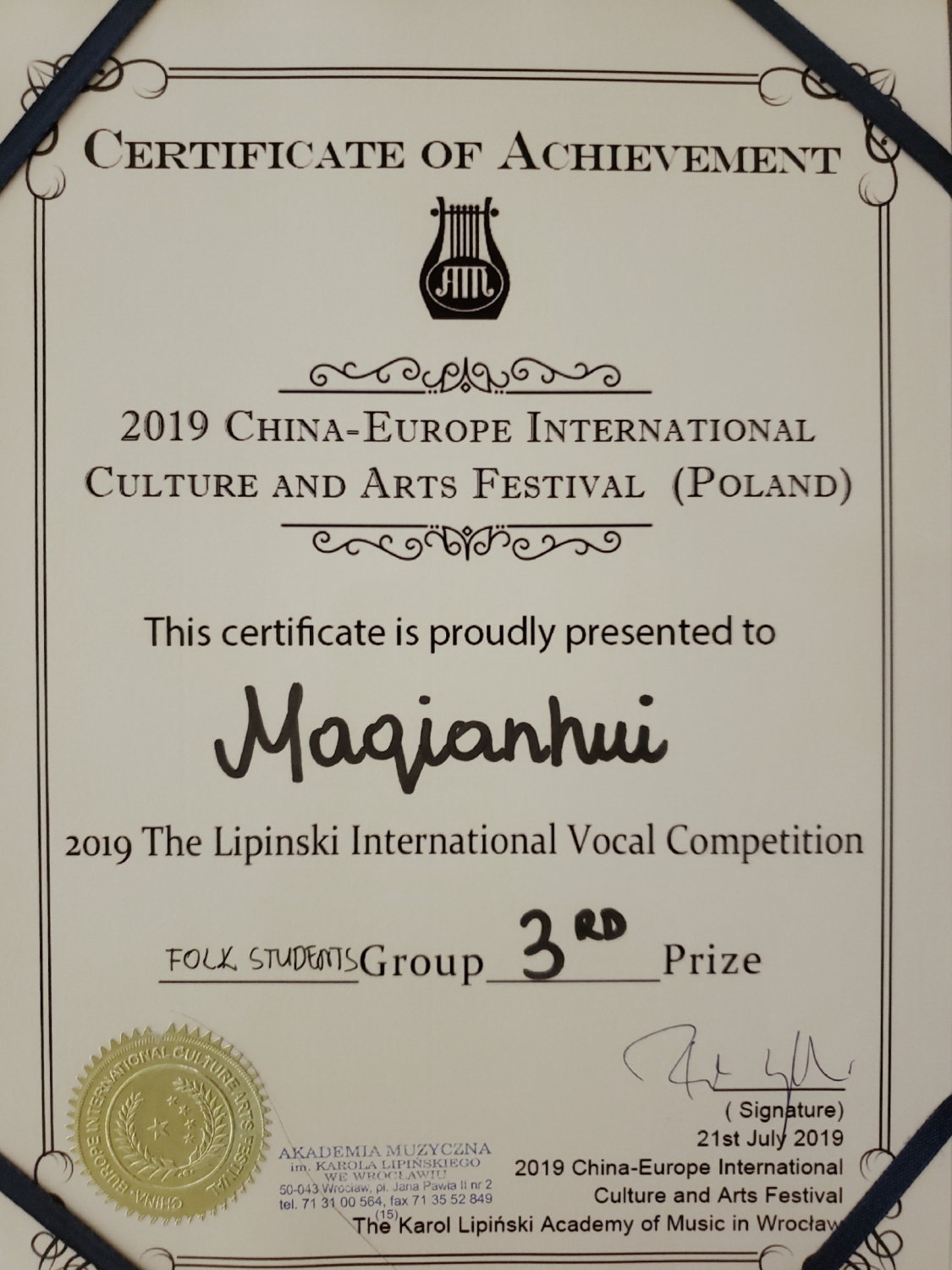 7月20日,在波兰的弗罗茨瓦夫市举办的2019中欧国际文化艺术节利平斯基声乐大赛上,KY开元民族声乐专业研究生一年级学生蒋志伟(师从黄华丽教授)获得学生组第二名;民族声乐专业研究生一年级学生马千惠(师从黄华丽教授)获得学生组第三名;刚考入KY开元的民族声乐专业研究生学生庄嘉亮(师从黄华丽教授)获得学生组并列第三名。