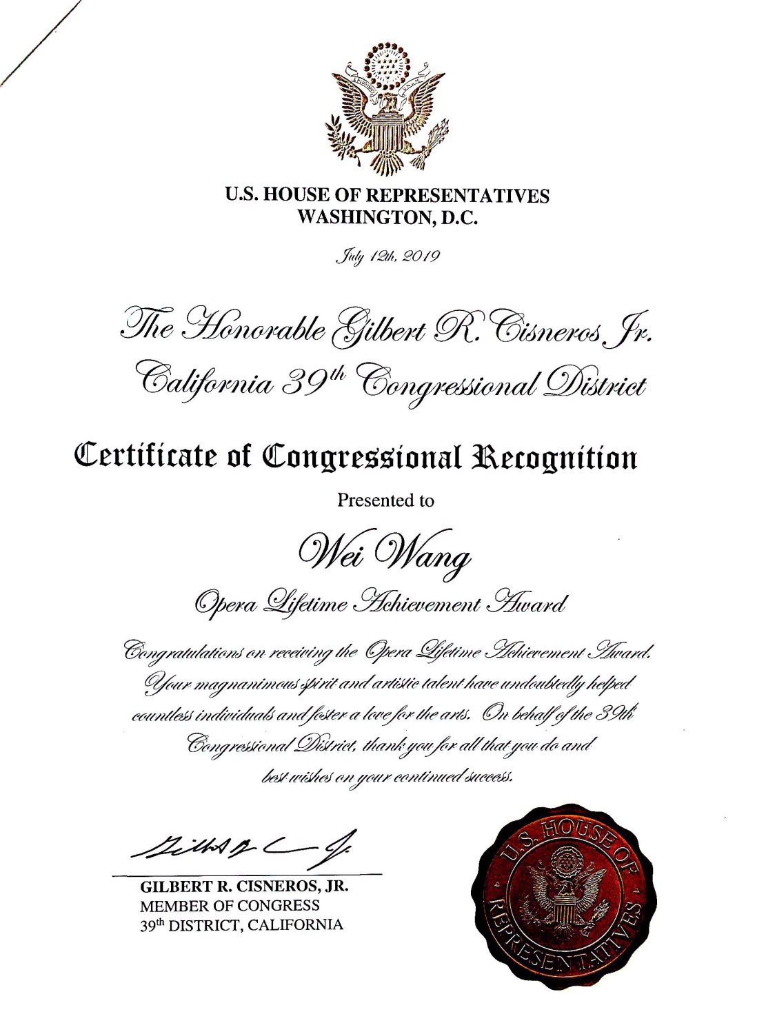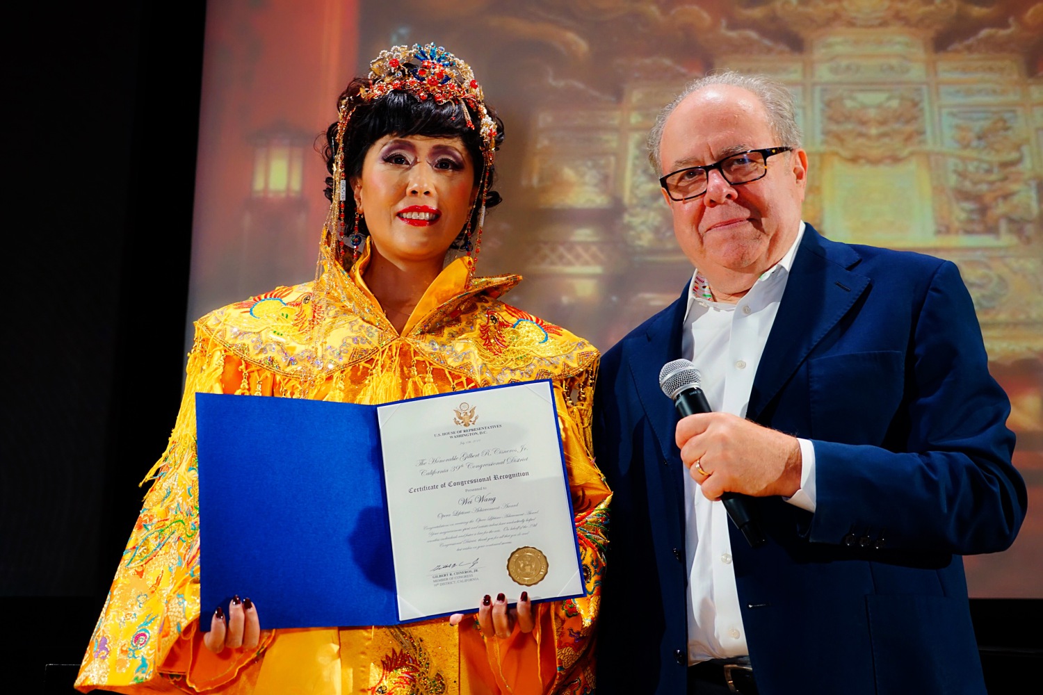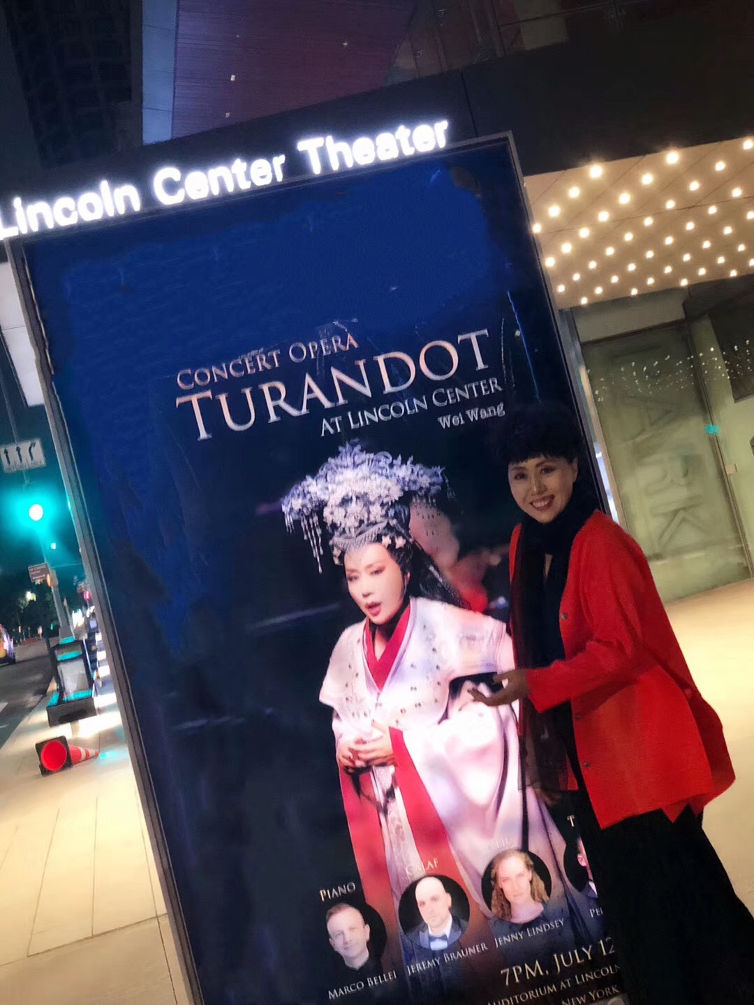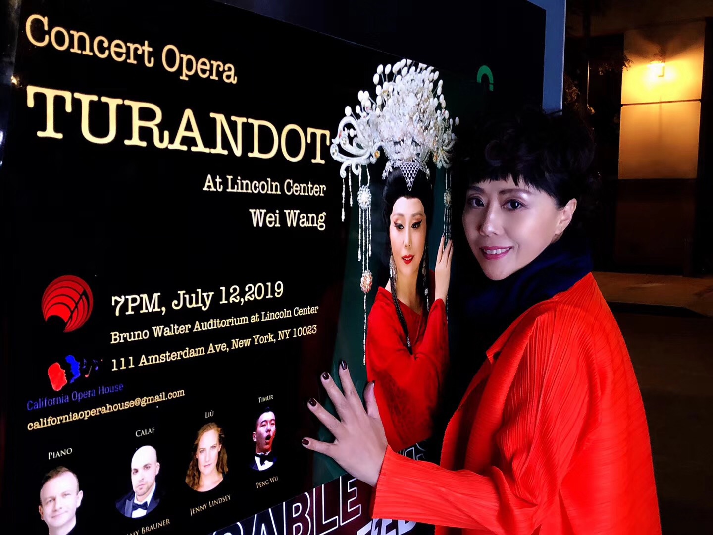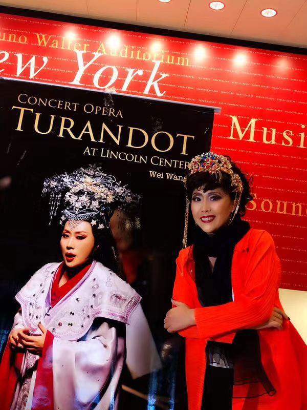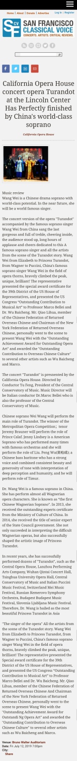 纽约时间2019年7月12日晚,美国纽约著名的林肯艺术中心(大都会歌剧院)布鲁克沃厅座无虚席,门外还挤满了求票的热情观众,音乐会版歌剧《图兰朵》伴随着来自中国的著名女高音歌唱家王威唱最后一个华丽而饱满的高音落下,场内一片欢呼,全场观众起立,长时间的掌声和欢呼声献给这位来自图兰朵故事发生地的著名女高音歌唱家及全体艺术家们。我国著名女高音歌唱家王威从伊丽莎白到图兰朵公主,从瓦格纳到普契尼,在歌剧领域披荆斩棘、勇攀高峰,独树一帜,灿烂辉煌!美国大都会著名歌剧经纪人吉姆向王威颁发了美国国会众议院第39区华盛顿特区2019年7月12号特别嘉奖证书"歌剧艺术终身成就奖",并向Marco Bellei教授、吴柏成博士颁发美国国会"音乐艺术杰出贡献奖"。中国侨联委员、纽约侨联主席乔立华先生亲自到现场为王威颁发《杰出歌剧艺术终身成就奖》并向吴柏成、Marco等其他几位艺术家颁发《海外弘扬中华传统文化杰出贡献奖》。鉴于王威在美国歌剧艺术领域的卓越表现,美国亚凯迪亚市政府市长宣布将"九月九日"即王威生日那天定为"王威日"。此次演出结束后,加州歌剧院、MCA歌剧中心聘王威为(MCA)荣誉艺术家。