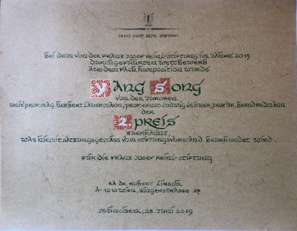 Franz Josef Reinl基金会是由奥地利慈善家Hilde Reinl为纪念作曲家奥地利Franz Josef Reinl以及竖琴演奏家Hermann Ertl而建立,基金会每年都会向来自世界各地的作曲家进行作品征集,并由专家评审团最终决定3个奖项。2019年的三位获奖者分别来自中国、韩国和荷兰。2019年6月28日,“Reinl-Preis 2019”颁奖音乐会在德国慕尼黑爱乐室内乐音乐厅举行,由慕尼黑Concetto;x室内乐团演奏获奖作品,基金会董事Ernst Grossmann博士和慕尼黑音乐和戏剧学院院长Bernd Redmann博士为三位获奖者颁奖。