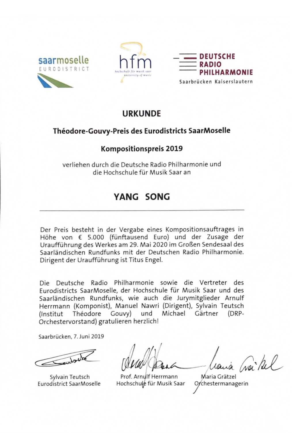 2019年6月7日晚八点,五部入选作品在德国萨尔布吕肯海尔贝格广播大厦音乐厅厅由德国广播爱乐乐团首演。经过现场评委和乐团成员的最终决选,宋杨的《déjà-vu》荣获Théodore-Gouvy-Preis大奖,以及德国广播爱乐乐团的新作品委约。音乐会实况录音将于2019年6月27日晚8点在德国萨尔广播文化频道中播出。