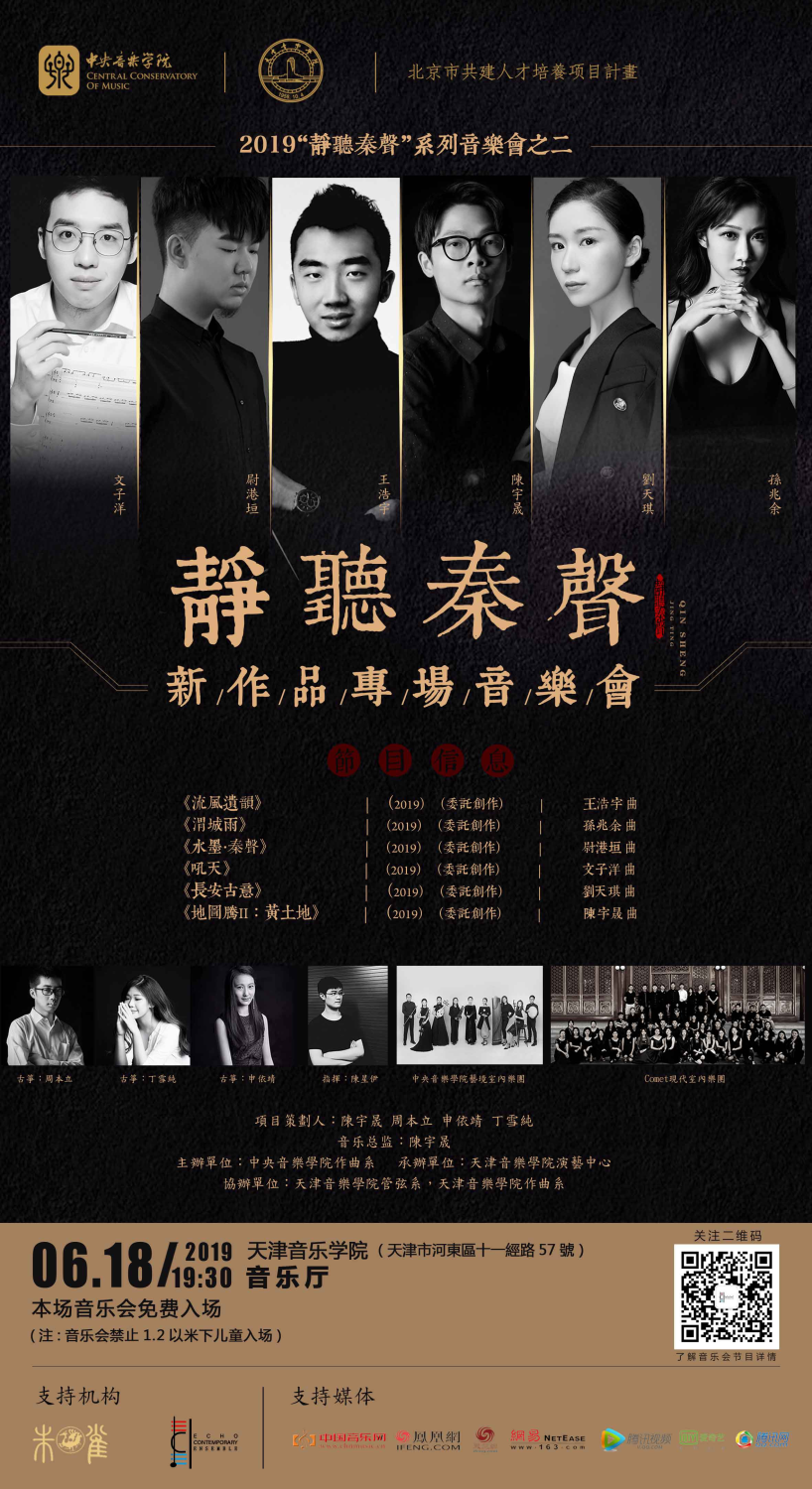 2019“静听秦声”系列音乐会是由16级民乐系学生(17级辅修作曲)陈宇晟和三位16级民乐系学生周本立、申依靖、丁雪纯联合主创策划。该项目入选了2018年北京市共建人才培养项目计划。