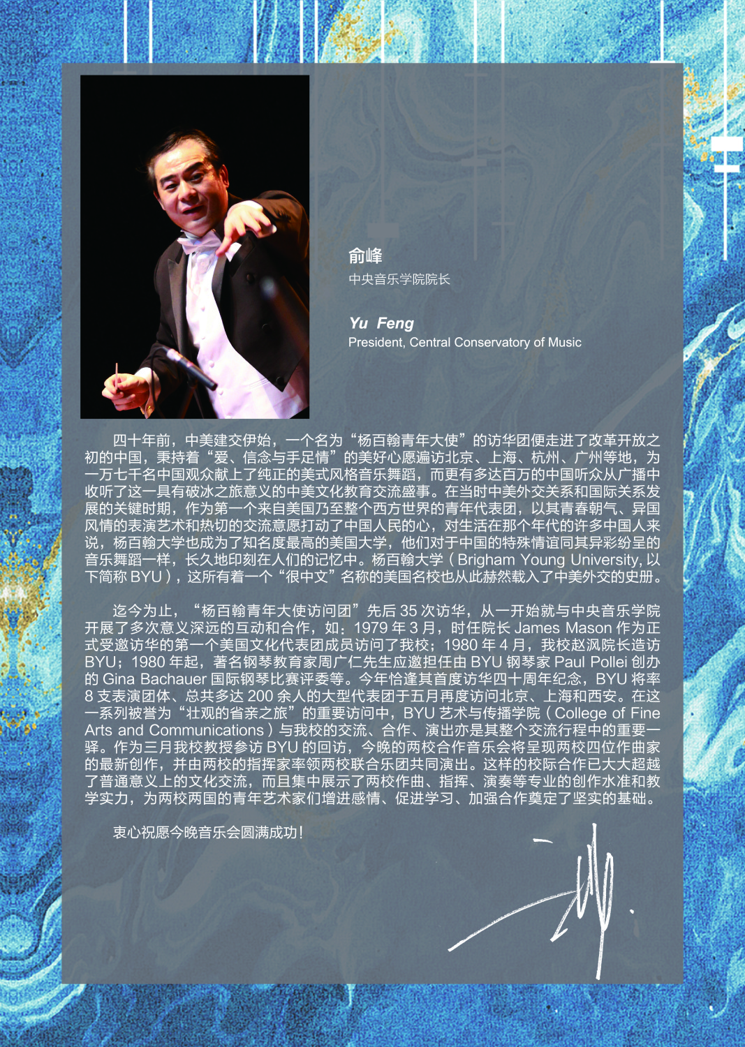 此次音乐会不仅是一次集合和展示两校创作、指挥、演奏等多方教学实力和艺术水准的盛会,也是KY开元与杨百翰大学艺术与传播学院(College of Fine Arts and Communications)校际交流的进一步延续。继今年3月KY开元贾国平教授、林涛教授、兰维薇副教授、青年教师代博等一行对杨百翰大学进行学术访问和艺术合作之后,两校师生心怀期待并精心筹备此次回访。此外,杨百翰大学室内管弦乐团此次访华还有一个更有意义的背景,即:杨百翰大学首度访华四十周年纪念。四十年前,正值我国改革开放之初,亦是中美刚刚建交。是年7月,一个由20位年轻的音乐、舞蹈表演者组成的“杨百翰青年大使”的访华团,带着“爱、信念与手足情”的美好心愿遍访北京、上海、杭州、广州等地的重要剧院,多达一万七千名中国观众现场观赏了他们为中国献上的9场正式演出和几十场非正式的即席交流表演,所到之处无不收获巨大反响和热烈回应,而更有多达百万的中国听众从广播中收听了这一具有中美文化教育交流破冰之旅意义的文化盛事。