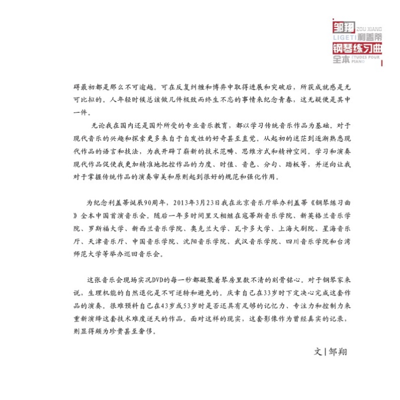 国内外历来极少有钢琴家完整公演全套利盖蒂钢琴练习曲。邹翔说:“利盖蒂钢琴练习曲极其繁杂的复合节拍、复合调性以及微复调织体对钢琴家提出了“非人性”的多维度挑战。相比录音棚录制,现场音乐会中连续演奏所有练习曲,其过程对于思维运作、技术驾驭和音乐表达的即时把控,以及迅速“转换”于每首练习曲之间截然不同的高难技术状态,都是对于钢琴家的残酷考验。现场音乐会生动真实地记录了我与作品所特有的‘机械化思维’之间一场惊心动魄的博弈过程,以及动态音乐会表演对于一系列蕴含不同创作和表演难度制高点的练习曲进行‘无缝隙’的控制和表达。”