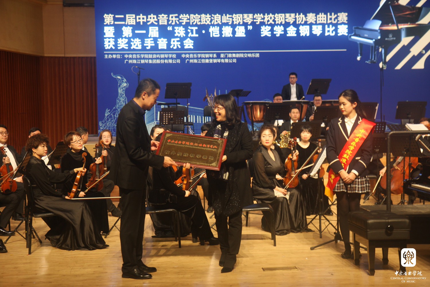 珠江钢琴集团副董事长、总经理肖巍先生与钢琴学校李昕校长对第一届“ 珠江·恺撒堡 ”奖学金获奖师生进行颁奖。
