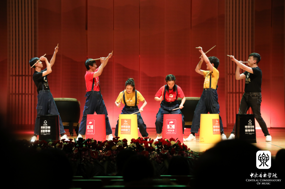 在观众热烈而持久的掌声与欢呼声中,弹拨乐团的成员带来了精彩的返场节目。这次的返场与以往不同,既不是经典曲目,也非新作,成员们“轻装上阵”,几组鼓槌、几个垃圾分类回收桶,便是一部轻巧活泼的小品。章红艳教授介绍到,这是弹拨乐团参加中国器乐电视大赛时准备的才艺展示,作品经过精心策划编排、结合当下社会需求,以提倡环保为出发点命名为《垃圾分类》。多元创新的思路让音乐充满生命力,用东方经典表达西方祝福的心意、扎根经典勇于开拓的新作、与时代共进而产生的创意,这三重新意让新年之新,变得更为亲切而鲜活。