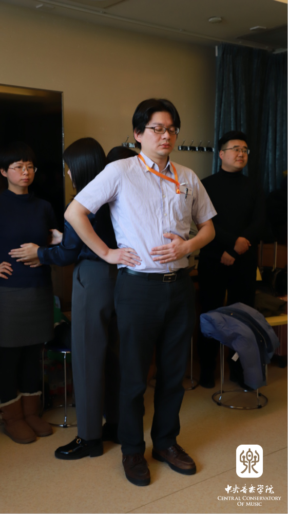 学员在体会膈肌下沉、腹部膨出的吸气过程