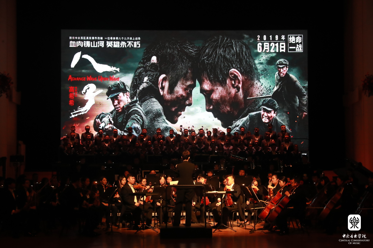 音乐会还演奏了作曲家张征为电影《八子》所作的两首配乐。伴随着流动的电影画面,陈冰副教授指挥交响乐团与合唱团,用感人至深的演奏与史诗般气势磅礴的合唱,描绘出电影中风雨飘摇的战事与沉甸甸的家国情怀。《八子》的配乐曾在延安10.15艺术节“为人民抒怀”——KY开元集团官网入口教师原创影视音乐作品专场音乐会中亮相,获得了强烈反响,展现了近年来KY开元作曲家们扎根人民、面向大众创作的优秀成果。