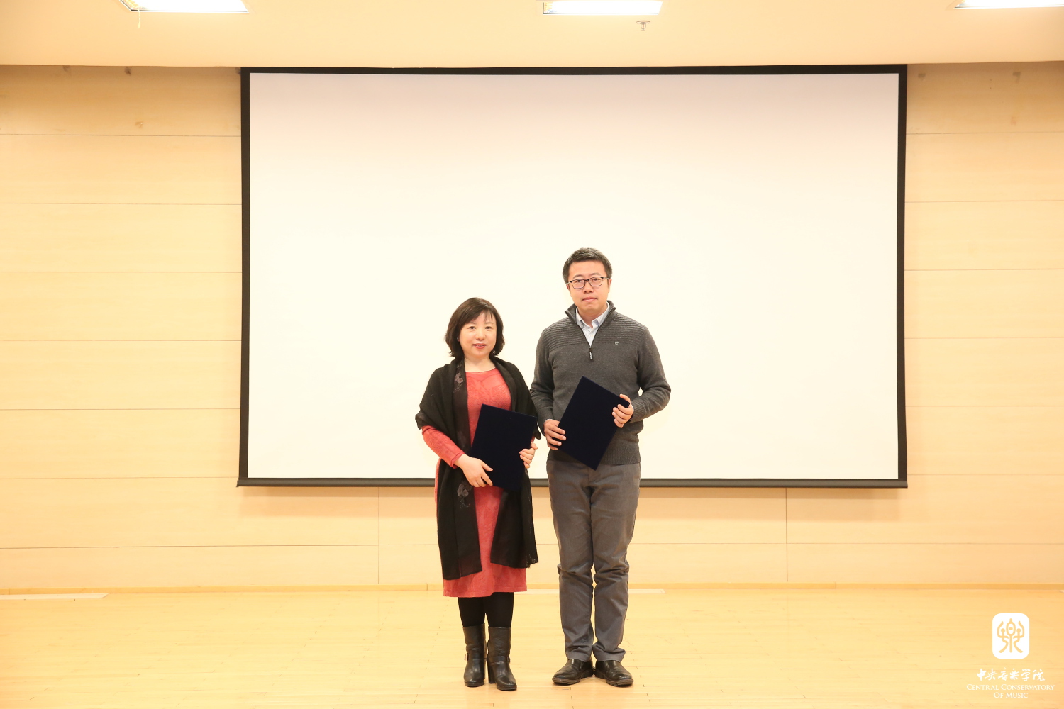 陈自明教授、郭淑兰研究员为央音“外派故事”征集比赛三等奖、优秀奖代表:韩译锐、崔颖、周麟一、曲帅、齐洁、季节颁奖