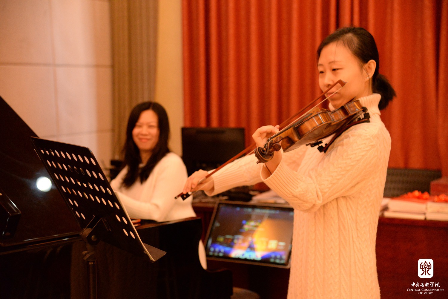 余原演奏钢琴、朱明月演奏小提琴为老人们唱歌伴奏
