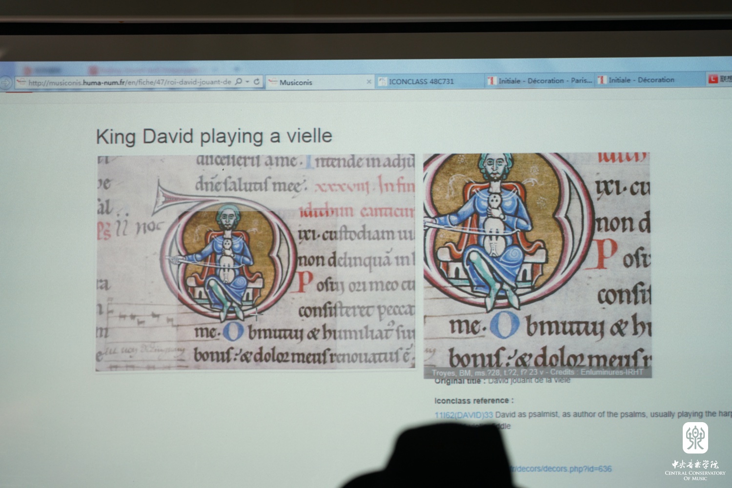 随后,苏珊教授介绍并现场展示了她所使用的资料库网站(www.musiconis.huma-num.fr/en/)。Musiconis网站由哥伦比亚大学与巴黎索邦大学共同建立,由法国大使馆提供3年的资金支持,旨在为学生提供数字化人文资源。该网站从中世纪大量的现存图像数据中收集整理与音乐相关的内容,并与其他领域数据库进行关联,除手稿、雕刻、壁画等艺术图像资料外,还包含对中世纪音乐图像的具体分析与阐释,可以使检索者便捷地搜索到图像数据的全部资源。她指出,中世纪的音乐图像研究,依赖于数字化人文学科的建立,数字化资源是研究中不可或缺的重要部分。