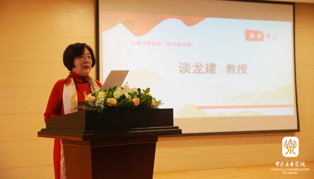 在秦文琛副院长致辞后,俞人豪教授(音乐学卷主编)、王次炤教授(音乐评论卷主编)、刘康华教授(作曲与作曲技术理论卷主编)、谈龙建教授(音乐表演卷主编)作为这4卷图书的主编,分别上台发言,从收录文章的种类、学术影响力等方面,对各分卷做了简要的介绍。
