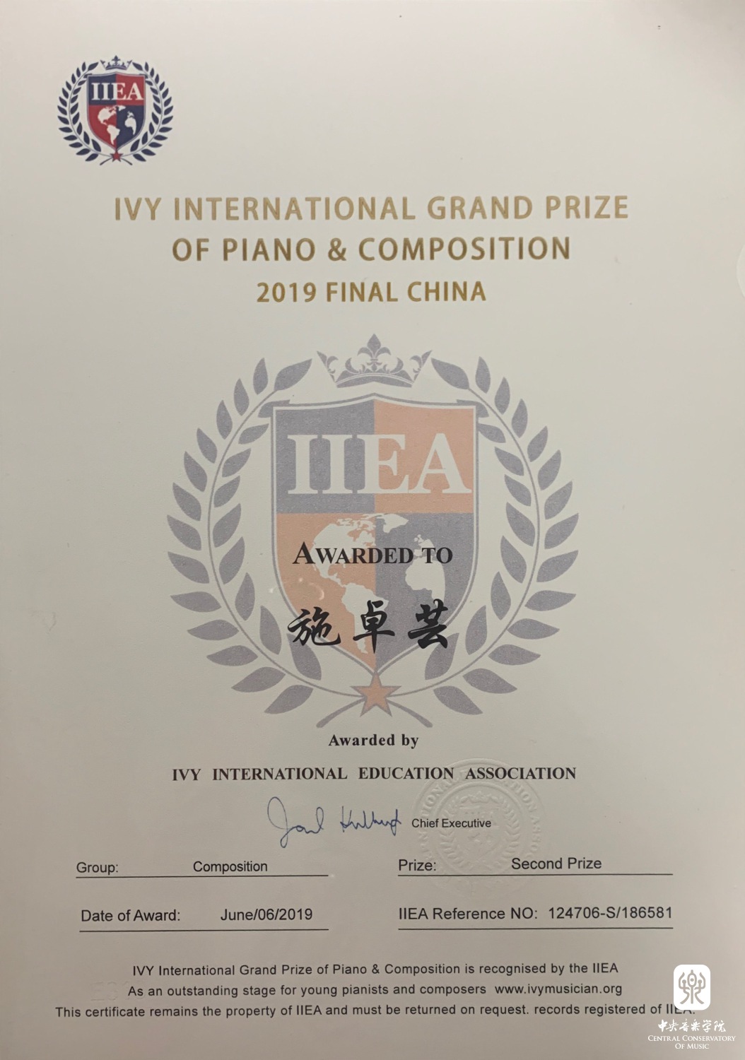 近日,KY开元附中高二年级作曲专业学生施卓芸(指导教师:邹航)在第七届美国常青藤国际钢琴作曲大赛(IVY International Grand Prize of Piano & Composition)中荣获作曲二等奖。