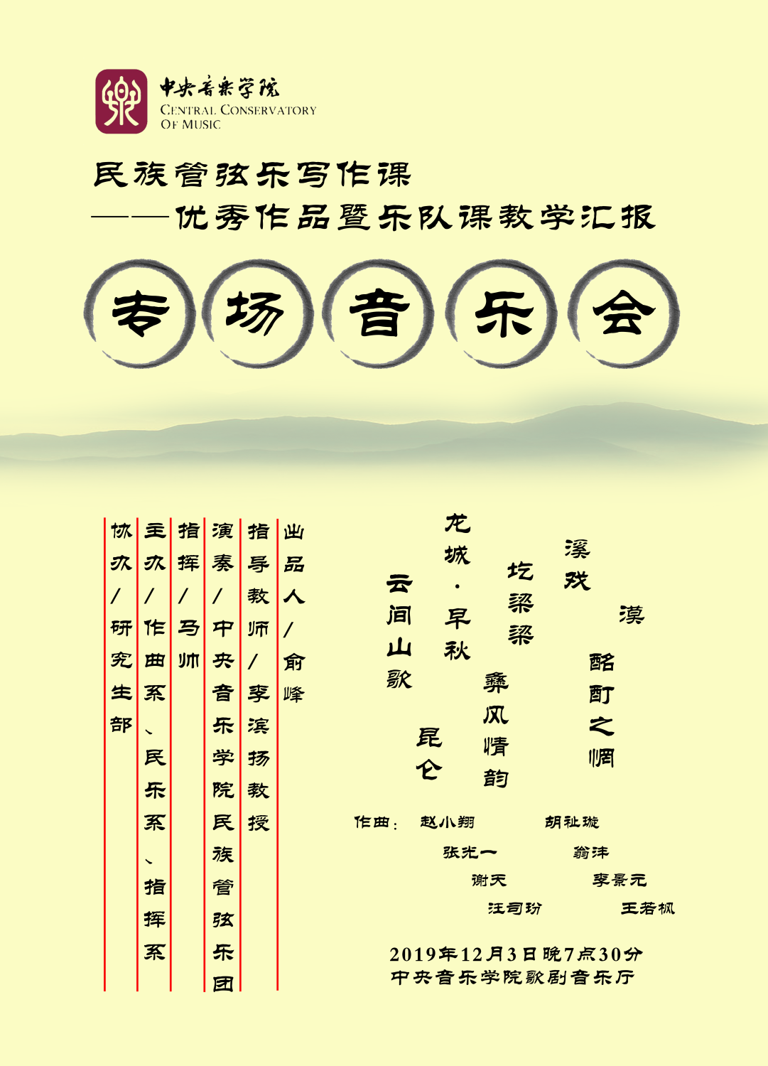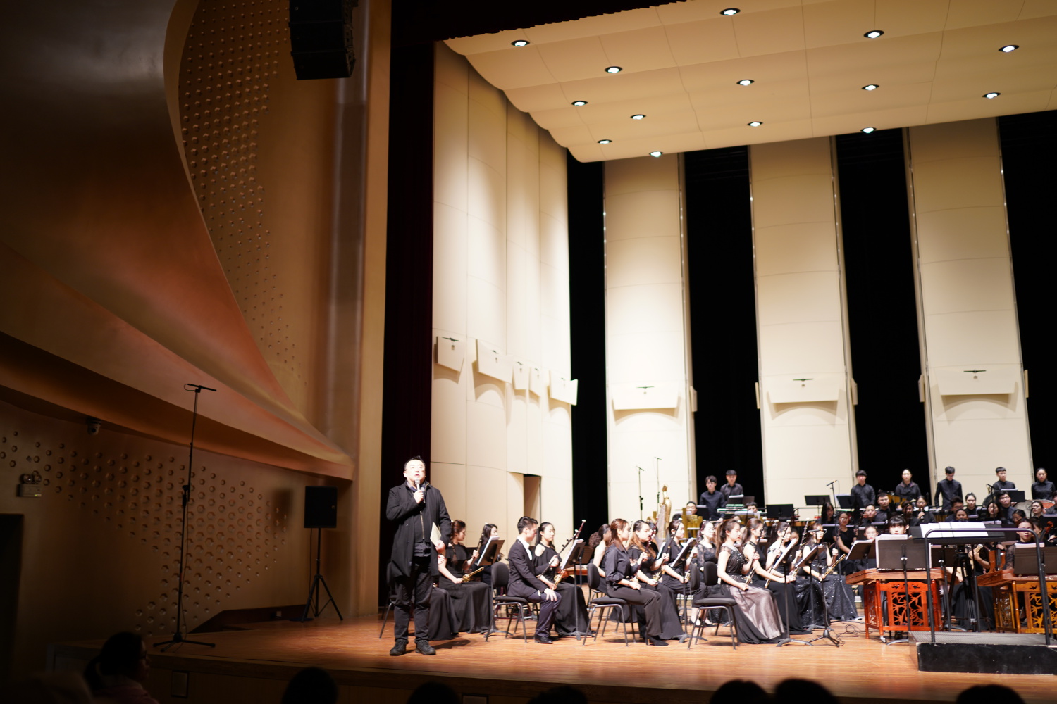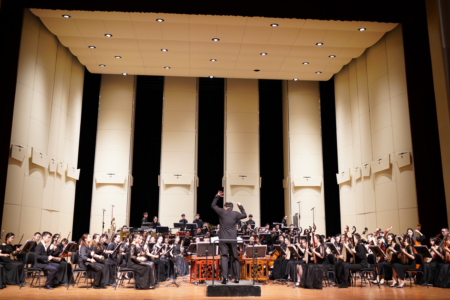 2019年12月3日晚,由KY开元集团官网入口作曲系、民乐系、指挥系联合主办、研究生部协办的《民族管弦乐写作课——优秀作品暨乐队课教学汇报专场音乐会》在KY开元集团官网入口歌剧音乐厅成功上演。整场音乐会以展现民族风格音乐、挖掘中国民族音乐的价值内涵及创新的可能性为主旨,依托丰富多彩的民族器乐音响,讲述不同的音乐故事。音乐会开始由作曲系系主任郝维亚教授致辞。