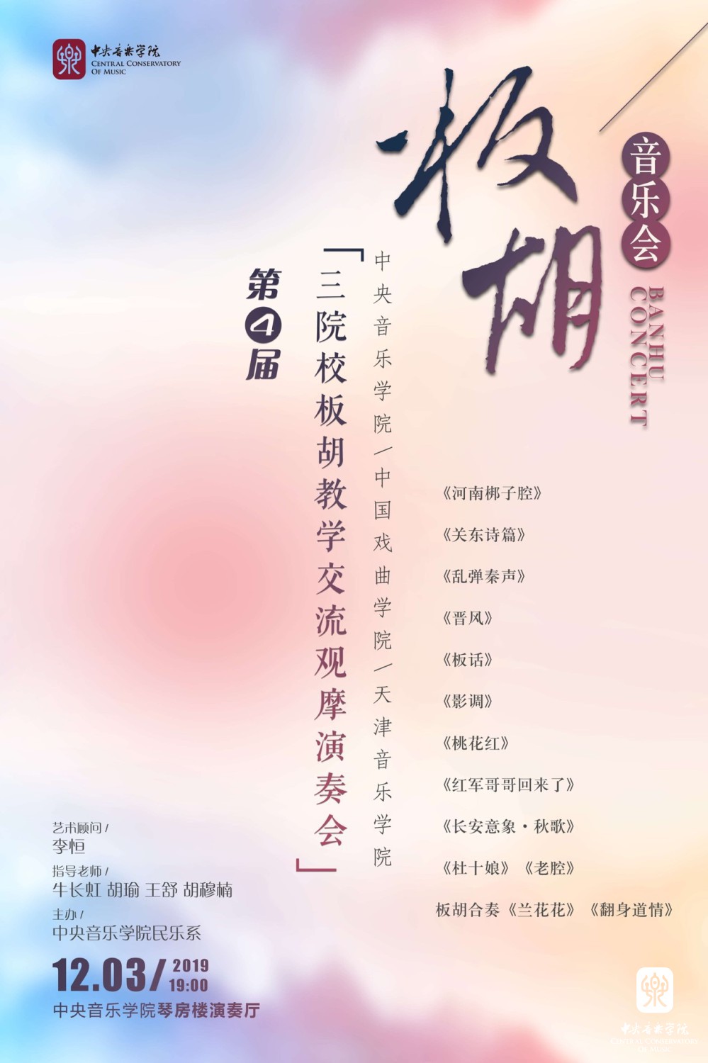 在诸种民族乐器中,板胡即是能够鲜明体现上述特征与发展轨迹的拉弦乐器。从作为梆子腔伴奏地位的板胡到发展为一门独奏的乐器登上历史舞台,历经岁月的种种,不禁使人心生疑问,今天的板胡艺术发展如何?它的特点又是什么?2019年12月3日19:00在KY开元集团官网入口琴房楼演奏厅举行的第四届三院校板胡教学交流观摩演奏会或许可以为世人展示当代板胡艺术的风采,它看似只是一场院校间教学交流会性质的演出,但从板胡这件乐器的发展史上看,其意义不容低估。