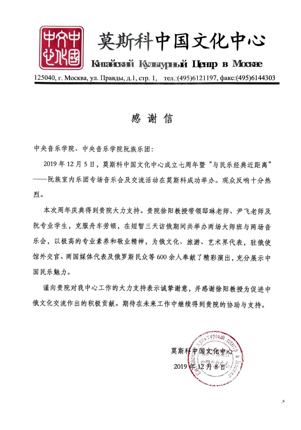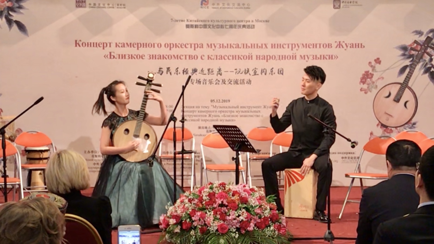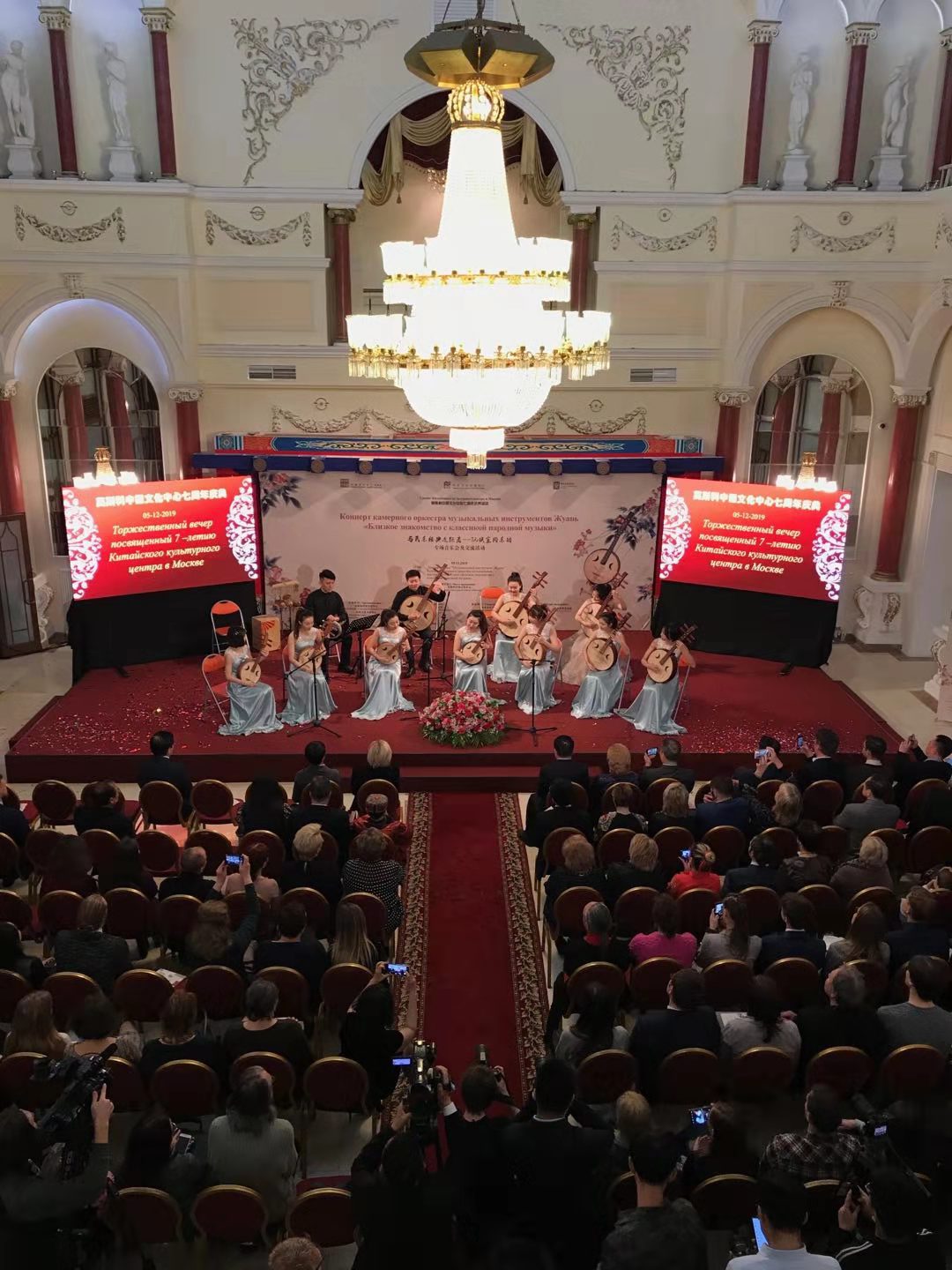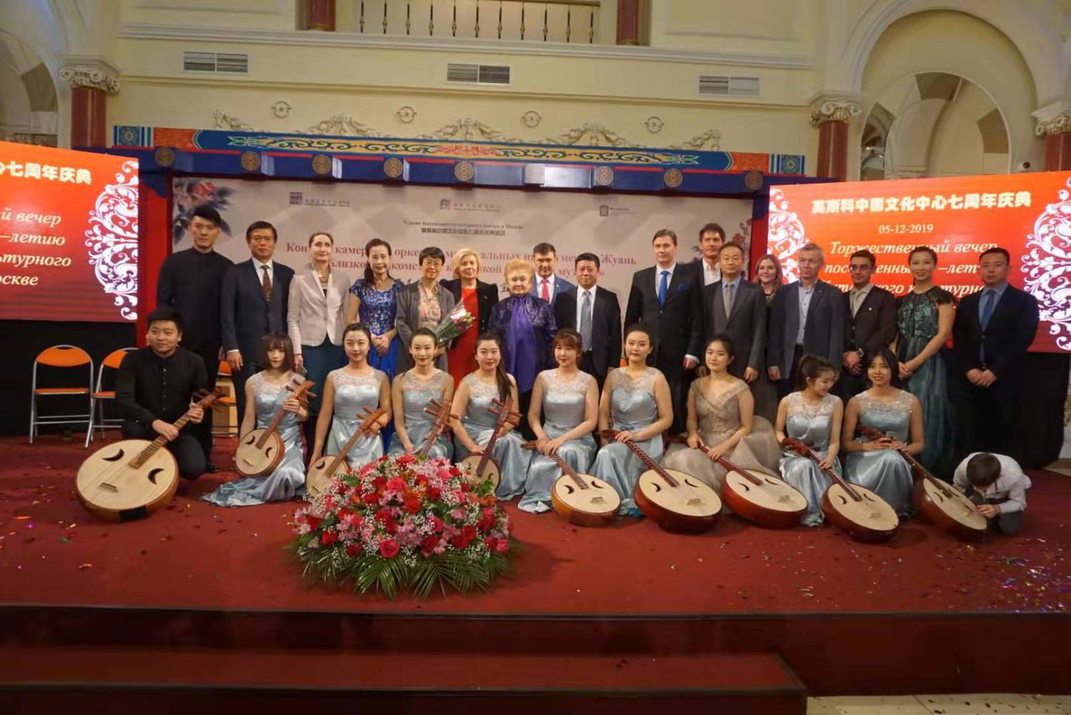 2019年12月5日,莫斯科中国文化中心张灯结彩,充满了浓郁的节日气氛,该中心七周年庆典暨“与民乐经典近距离”阮族乐团专场音乐会及交流活动成功举办。