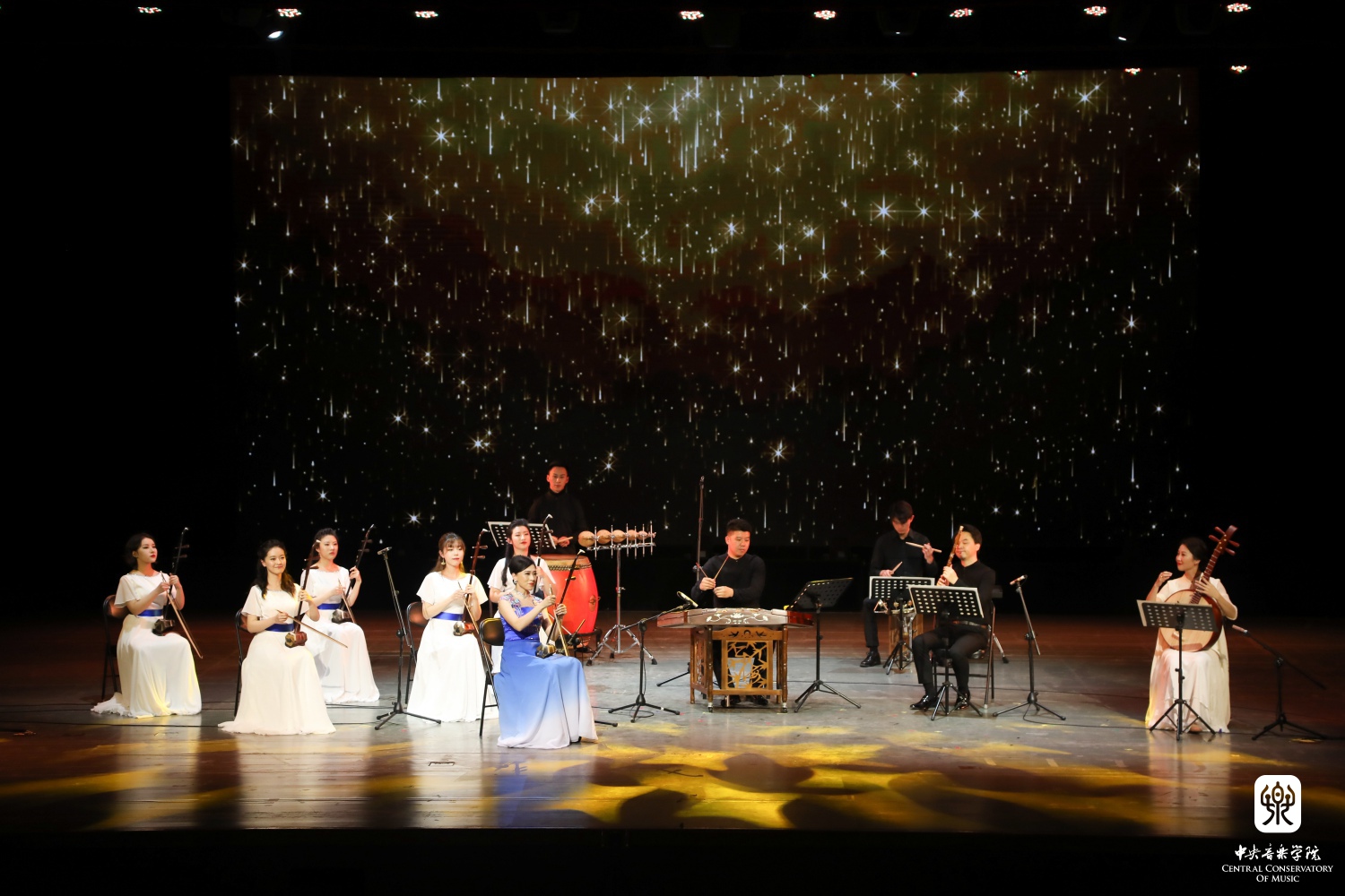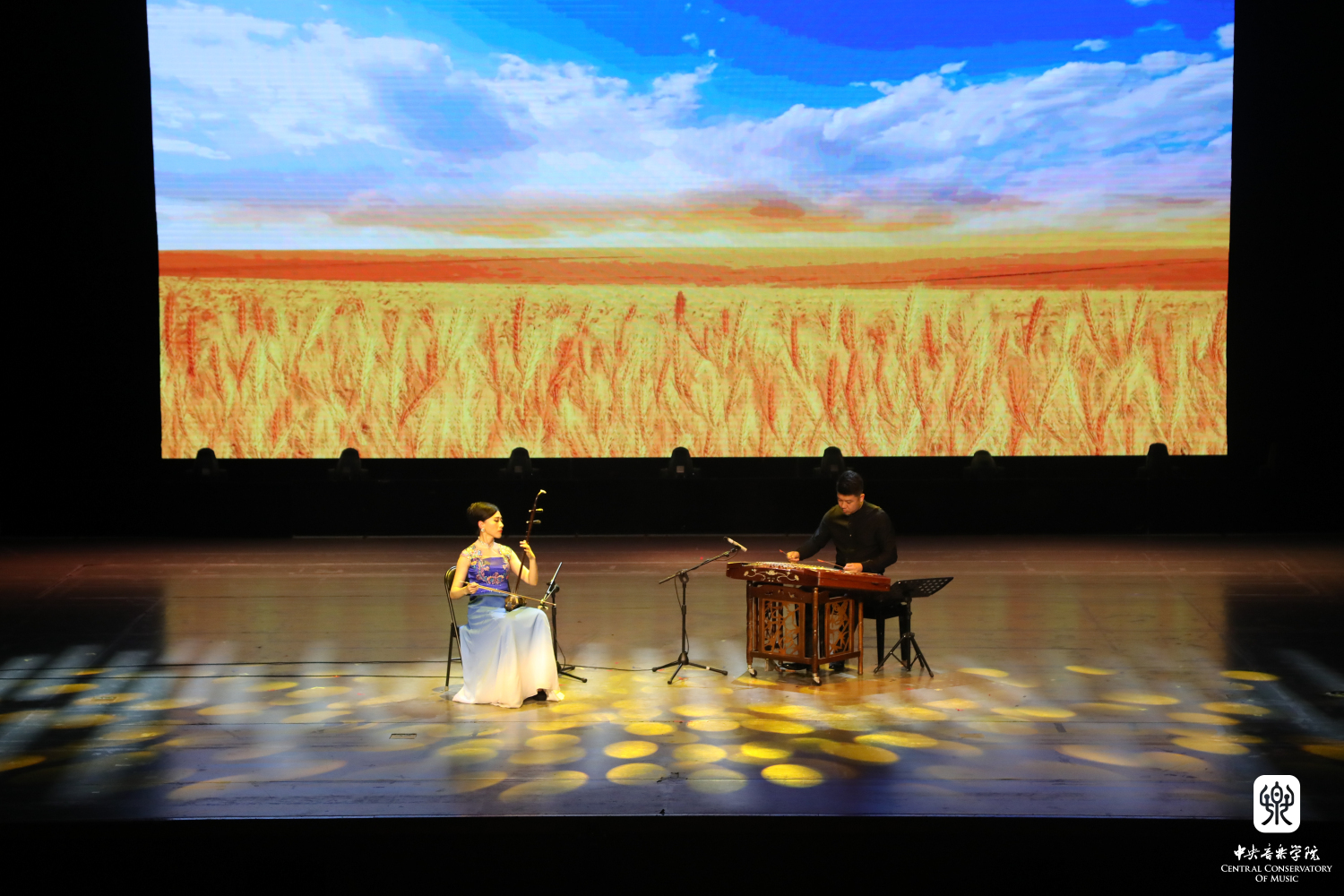 从上世纪走来的音乐渐渐推进,《幸福回响》篇章表达了质朴而纯粹的民间心声。杨雪老师与扬琴演奏家刘音璇将《郿鄠调》浓郁的陕西风情与《丰收》的欢乐景象化为琴声展现眼前,在不断变化的舞台背景衬托下,描绘着“稻花香里说丰年”。而青年作曲家张诗乐全新编配的二胡与室内乐版本的《幸福的歌儿唱不完》则更加丰富了这份喜悦之情。作品由担任双千斤二胡独奏的杨雪老师邀请扬琴演奏家刘音璇、打击乐演奏家魏然、冯飘扬还有学生张祺曼、付薪羽一同演绎,以当代人的视角唱出了对于美好生活的向往。
