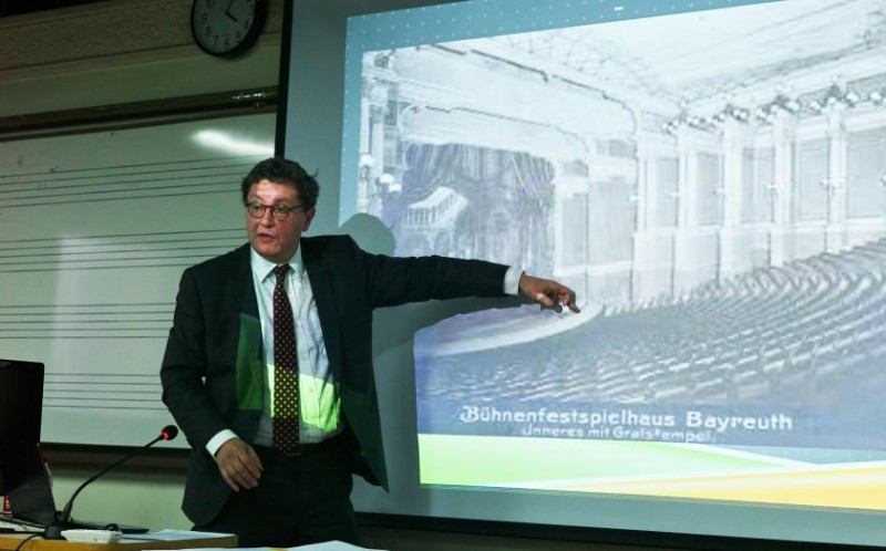 在首场讲座中,威利教授历时地回顾并梳理了瓦格纳对剧场音效对追求与探索。教授认为,诉诸德国拜罗伊特剧院的瓦格纳式音效,实际上是瓦格纳毕生探索的结果,对拜罗伊特剧院音响效果的探索贯穿于瓦格纳的整个艺术生涯。