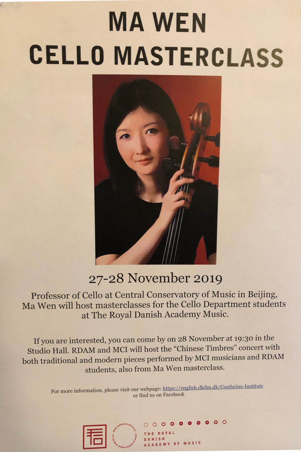 11月26日-28日,管弦系大提琴教授马雯应丹麦皇家音乐学院邀请,赴哥本哈根进行公开讲学活动。