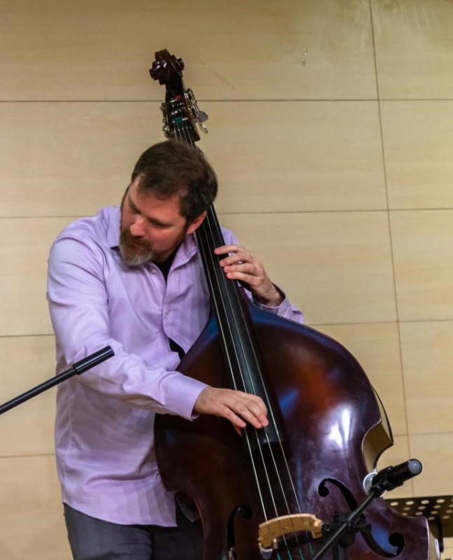 爵士低音提琴演奏家鲁道夫·爱德华·佩雷斯(Edward Perez)与乌兹别克斯坦手鼓演奏家阿巴斯合作,上演了由美国著名爵士钢琴家Chick Corea编写的乐曲《西班牙》。该乐曲以西班牙作曲家罗德里戈著名的《阿兰胡埃斯协奏曲》第二乐章主题开始,之后由演奏者根据作曲家的提示进行即兴演奏。Bass低沉的音色搭配拉丁美洲的特殊节奏,让观众欣赏到略带随意和充满魅力的爵士风情。乐曲结束后,KY开元音乐学系世界民族民间音乐专家陈自明教授对乐曲开头摘引的旋律进行了补充讲解,不仅增进了观众对该作品原始主题的理解,更加深了对这首融汇了浓郁爵士风格即兴新作的体悟。