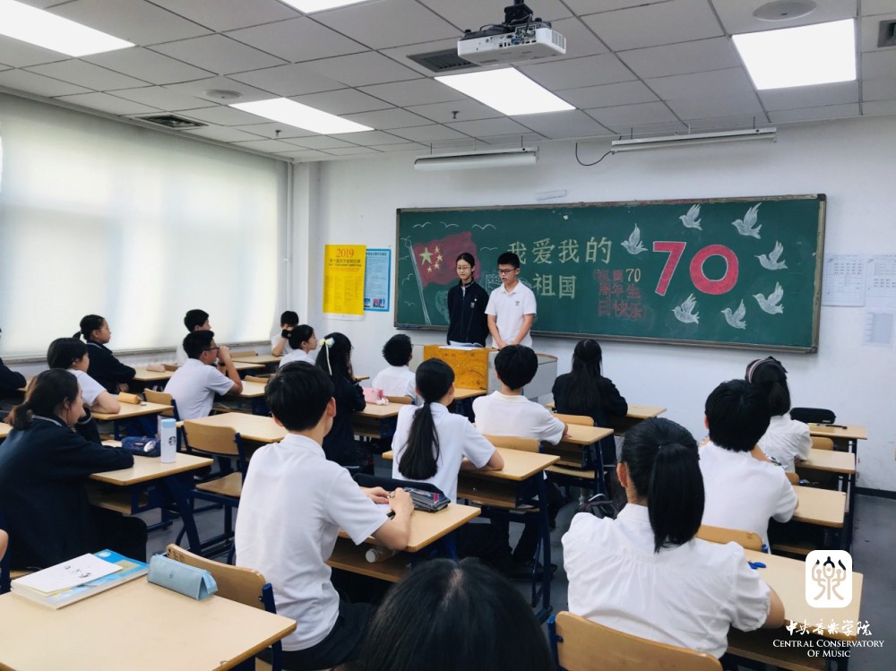 主题演出显特色。作为一所特色鲜明的音乐附中,在附中党总支的指导下,附中团总支积极发挥学校学生专长和特色,在演出活动方面,以庆祝中华人民共和国成立70周年为主题,结合学校主题教育工作安排,先后组织学生在校园内举行《我和我的祖国》演奏演唱快闪活动,反响热烈,激发了全校师生的爱国主义情怀。