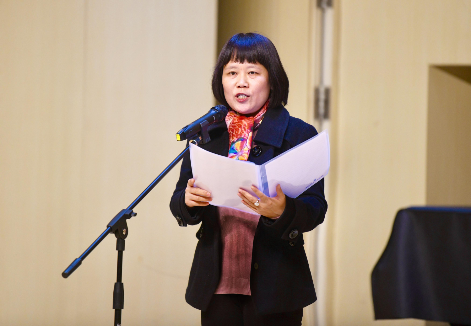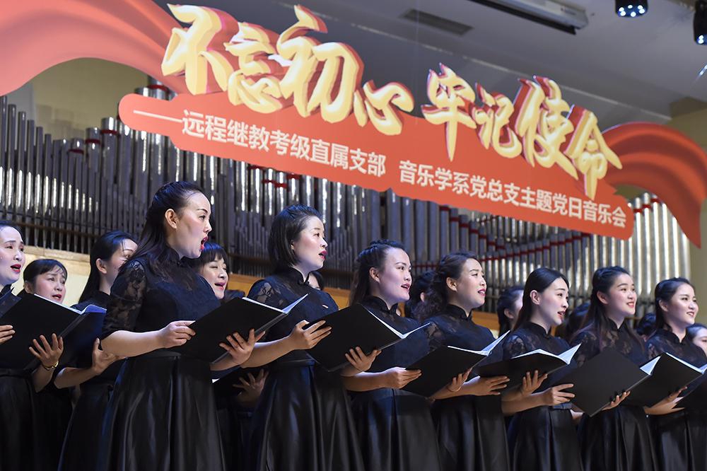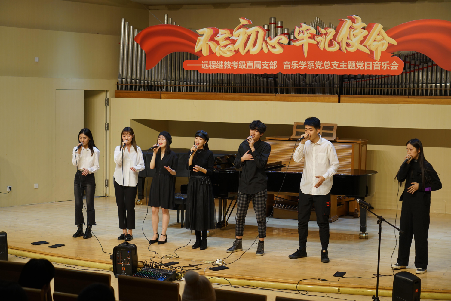 音乐学系党总支书记吴晓萍同志代表活动主办单位致辞,她说,为深入学习贯彻习近平新时代中国特色社会主义思想,全面贯彻党的教育方针,落实立德树人根本任务,远程继教考级直属支部和音乐学系党总支组织开展了一系列思想教育活动。同时,我们大胆创新、积极探索,将党建与科研教学、党建与专业实践深度融合,在韩瀚老师开设的“合唱文献导读”选修课等课程中融入思想教育元素,结合时政热点,对新中国成立时期和新时代时期的作品进行分析和演唱,进一步推动新时代精神进课堂、进舞台、进头脑。这种将思想政治教育“润物细无声”地融入课堂教学,可以说是对教育部所倡导的“课程思政”的生动实践,是非常有益的探索和尝试。未来我们要继续发挥党支部的战斗堡垒作用和党员的先锋模范作用,“不忘初心,牢记使命”,努力在创建世界一流大学方面走在前列,为实现中华民族伟大复兴的中国梦作出新的更大的贡献。