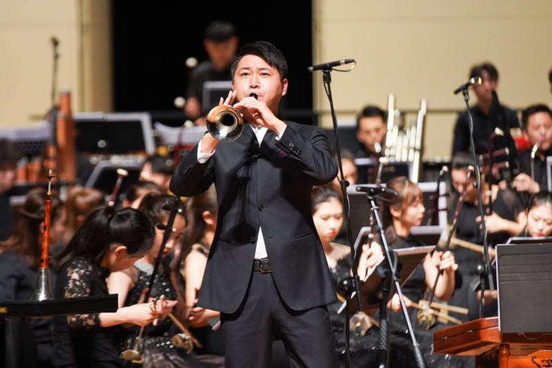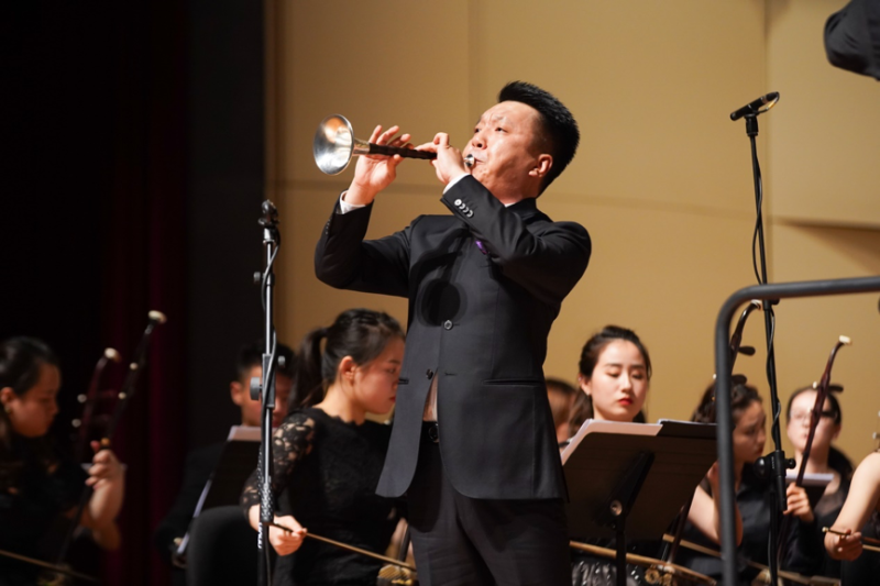 青年教师张维维演奏的唢呐协奏曲《塞上风情》,是从马迪先生1997年创作的笛子独奏曲移植而来的曲目,以陕北民歌《泪蛋蛋抛在沙蒿蒿林》作为素材改编而成。引子和慢板部分,唢呐深长的气息如悲如啼。其中对民歌主题进行的变化处理,增强了乐曲的叙事感。快板部分热烈激越,气质淳朴,以唢呐演奏的长音为乐曲强收,绽放出一种生生不息的活跃。