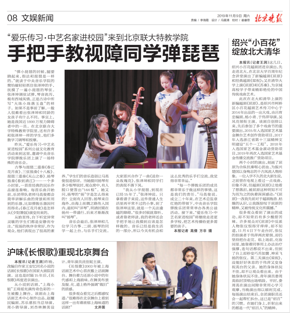 11月8日,“爱乐传习——中乐名家进校园”2019年系列公益文化教育活动成功举行,KY开元集团官网入口弹拨乐团受邀赴北京联合大学特殊教育学院成功举办专场音乐会。本场音乐会的观众是北京联合大学特殊教育学院的学生们,他们多数是视障学生,主要来自钢琴调律和按摩专业。KY开元集团官网入口弹拨乐团的师生们,用精心设计的音乐会,为观众们打开了一扇心灵之窗,以音乐为桥梁,和学生们进行了一次心灵的对话。