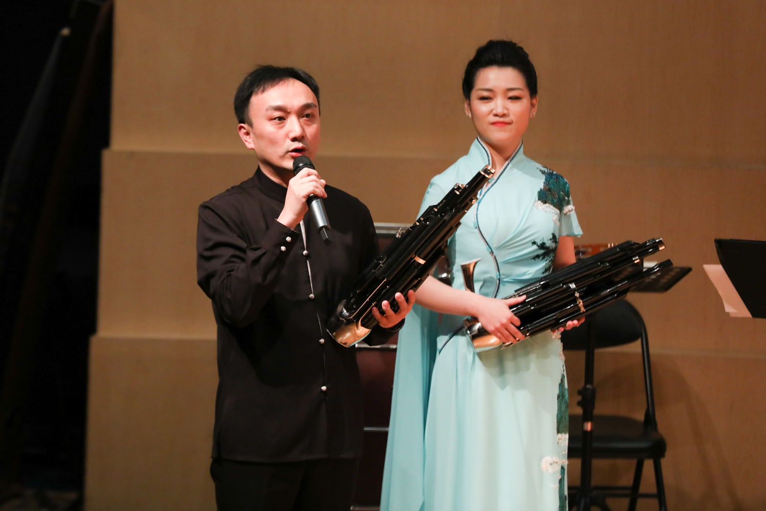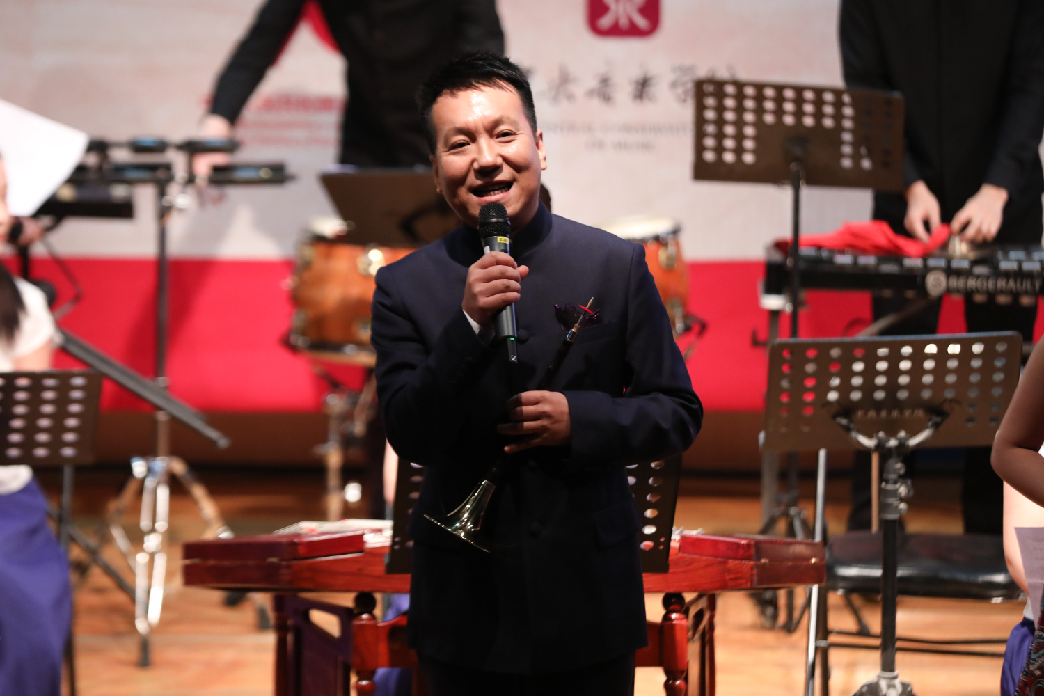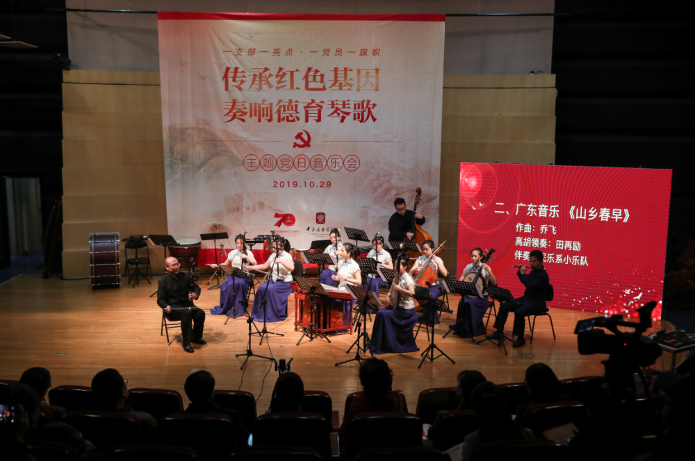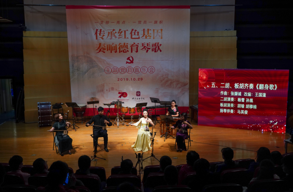 在开场的讲话中,民乐系党总支书记石海彬教授提到,民乐系党总支用音乐、艺术拓展主题党日形式,用音乐诠释对初心、使命的理解。民乐系教师支部书记杨雪副教授向观众介绍,讲演结合的形式是此次音乐会的一大亮点。通过讲解、分享,老师们将用具有家国情怀、爱国主义的经典民乐作品表达对初心的感悟。此次音乐会,是民乐系党总支以极高的凝聚力,通过师生党员同台合作的形式奏响德育琴歌,同时也向祖国母亲70周年华诞献礼。