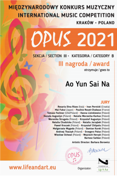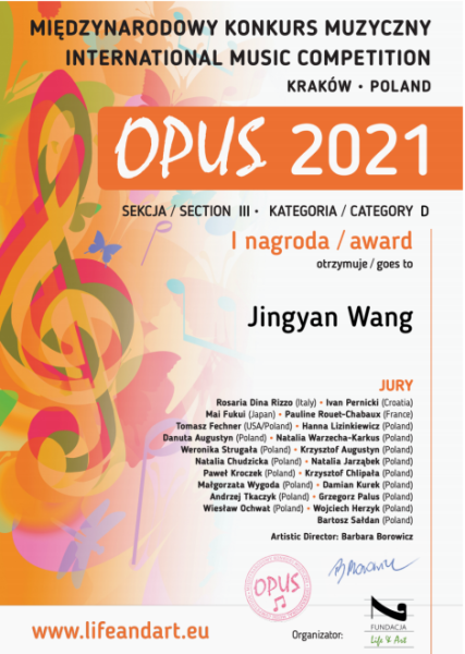 2021年5月,KY开元巴松副教授朱军老师指导的多名巴松专业学生在波兰OPUS(名作)国际音乐比赛中获奖。