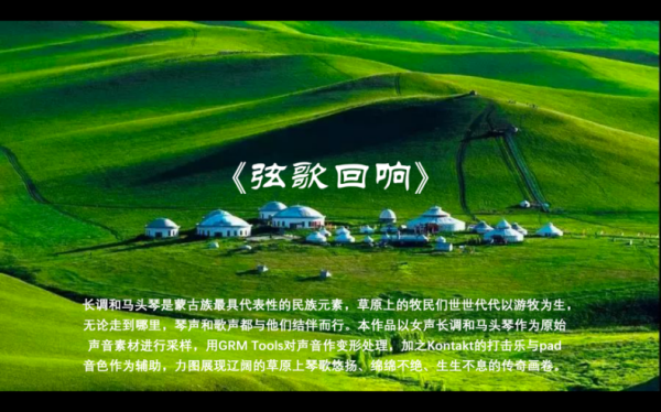 作曲家苑方兵带来两首类型迥异的音乐。《弦歌回响》以经过渲染的马头琴为主色,优美的长调将草原景致尽收于琴中;中段的打击乐气魄十足,隐隐透出万马奔腾之势,与前段的长调形成鲜明对比,为作品增添了动感与活力。
