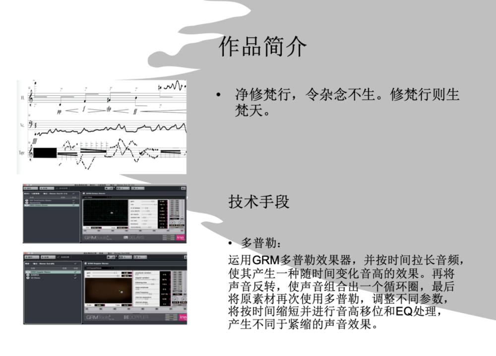 周佼佼副教授表示:作曲系博士班的同学们在一年的课程中,掌握了现代化的电子音乐技术,如Midi技术、音频技术、采样技术等。虽然制作经验尚浅,但他们充分发挥了博士班的作曲功力,在音乐创意、音乐与声音的融合、音乐的结构与组织等方面,都彰显出较强的创作才能。