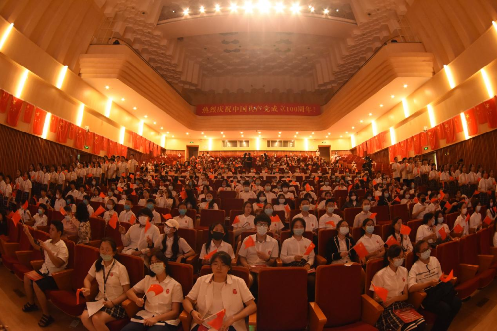 台下师生挥舞国旗,庆祝党的生日