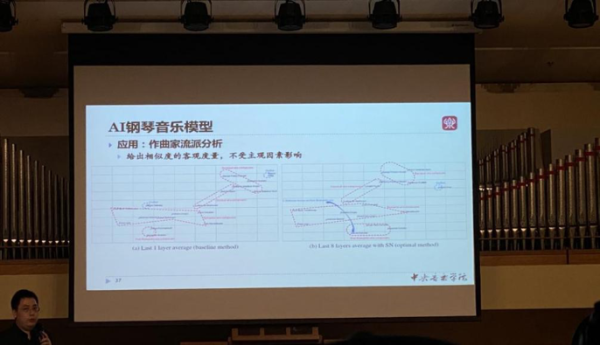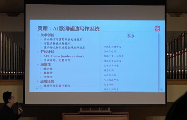 相较于刘家丰轻松、幽默的演讲方式,第二位主讲嘉宾张昕然的演讲风格则显沉稳和学术性。他主要分享了自己及其团队目前的研究成果——AI歌词辅助写作系统。