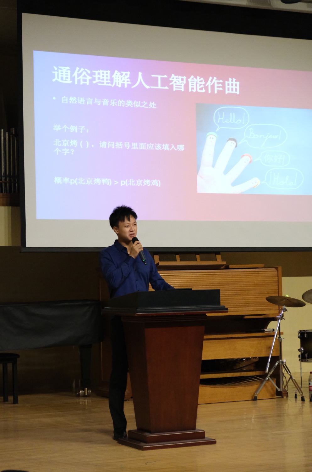 刘家丰正在向观众阐释自然语言与音乐的类似之处。