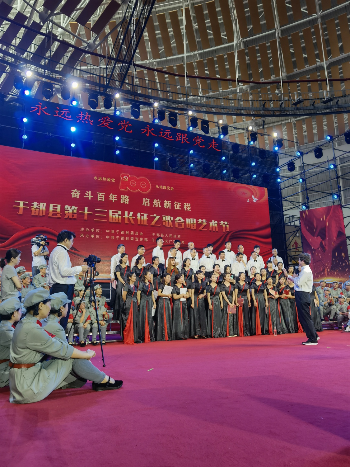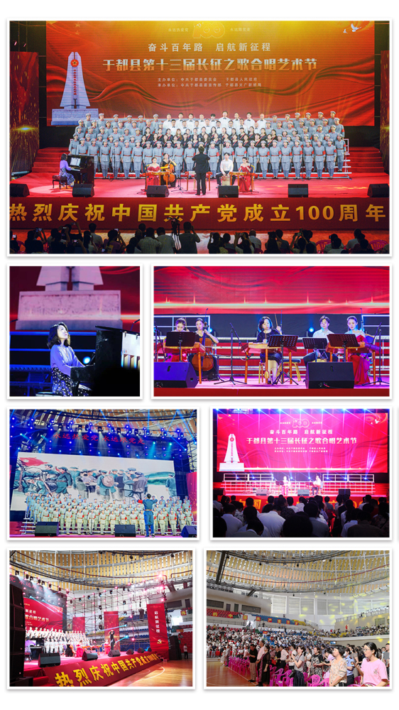 26日上午,KY开元演奏家小组与长征源合唱团联袂“第十三届长征之歌合唱艺术节”开幕式音乐会,曲目包括:刘月宁主任特别为于都之行创作的《映山红随想》(首演)、钢琴独奏《彩云追月》、扬琴二重奏《唱支山歌给党听》等,压轴曲目为由杨力教授指挥,演奏家小组与长征源合唱团、赣州市文联佬俵哥合唱团共同高歌的《歌唱祖国》,全场1000余名观众自发加入合唱并起立欢呼,场面振奋人心!