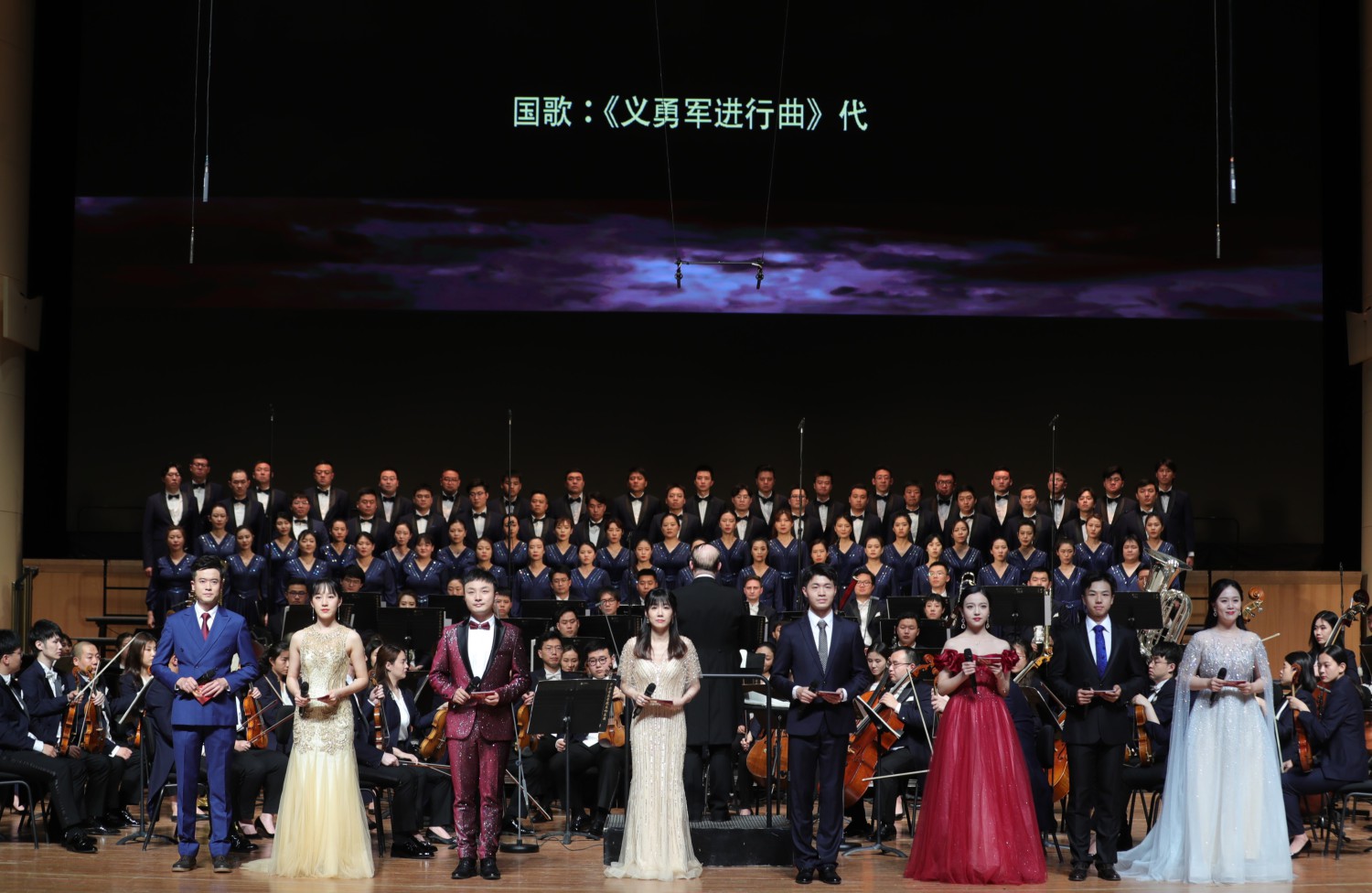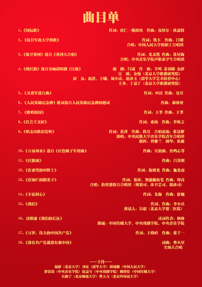 音乐会由北京大学温静、清华大学刘充、人民大学胡铖渤、北京外国语学院于谨阳、中国传媒大学魏博伦、北京师范大学吴海宁、KY开元集团官网入口的翟寰寰、中央戏剧学院赵嘉兮8所高校的8位同学联合主持;KY开元集团官网入口和延河联盟院校组成的联合学生合唱团激情演唱《黄河大合唱》中的《保卫黄河》;来自中央民族大学身着56个民族节日盛装的学生深情演唱《唱支山歌给党听》;抗大的传承单位之一——中国人民大学教职工合唱团齐唱《抗日军政大学校歌》;北京大学、清华大学联合表演歌剧《江姐》选段《绣红旗》(北大歌剧研究院院长金曼扮演江姐);中央戏剧学院、中国传媒大学、KY开元集团官网入口的同学带来配乐诗朗诵《我们的长征》;北京大学第三医院援鄂医疗队队员、90后党员吴超医生现场讲述了在抗疫一线淬炼成长的感人故事,并和KY开元集团官网入口交响乐团、合唱团演出朗诵及交响合唱《我们》。由KY开元集团官网入口和北京高校代表组成的联合学生合唱团共同演唱《万岁!伟大的中国共产党》。音乐会最后,在京高校和延河联盟院校的代表高举校旗走上舞台,与全场观众一起高唱《没有共产党就没有新中国》。音乐会在返场曲目《我和我的祖国》歌声的高潮中结束。
