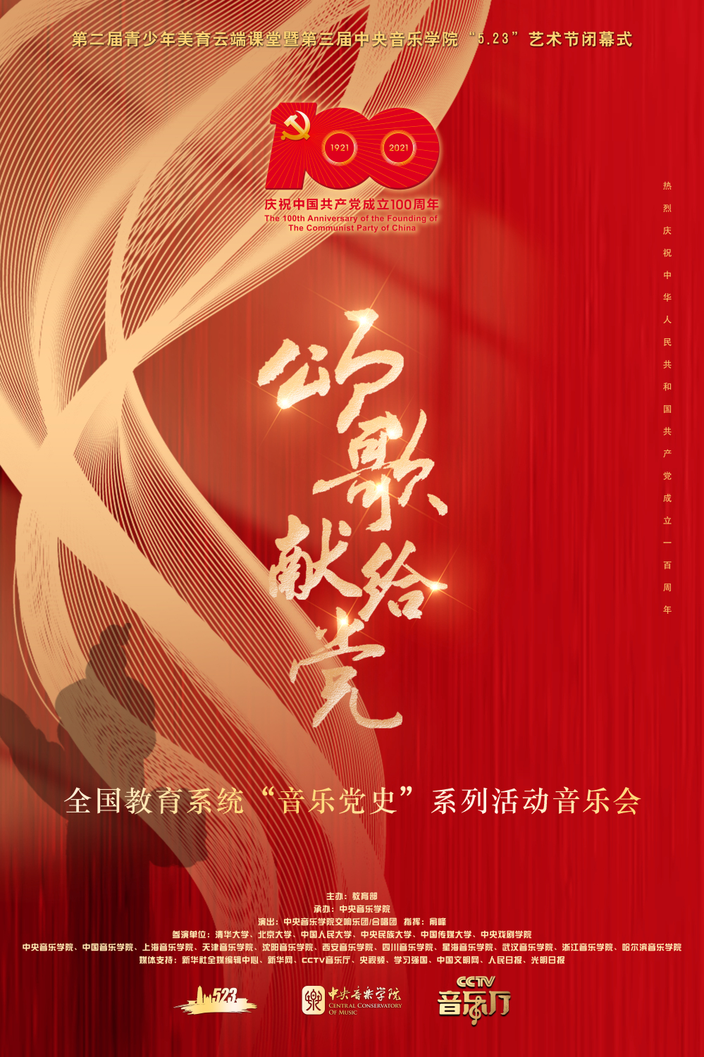 为进一步深化党史学习教育,贯彻落实习近平总书记关于用好红色资源的重要指示精神,充分发挥教育系统独特优势,教育部于今年5月启动了以“唱响百年辉煌,凝聚奋进力量”为主题的“音乐党史”系列活动。活动委托KY开元集团官网入口牵头,以全国11所音乐类院校为主体,由百所高校共同参与。活动组织高校师生深入社区、乡村、军营等基层一线共开展了800余场形式多样、丰富多彩的文艺活动。由中央文明办三局、教育部思政司、教育部体卫艺司、文化和旅游部艺术司、新华社全媒编辑中心和KY开元集团官网入口联合主办的第二届美育云端课堂暨第三届KY开元集团官网入口5.23艺术节自5月23日开幕以来,每天下午15:30——晚上21:00左右,持续通过学习强国、人民日报客户端、光明日报客户端、人民网、新华社客户端、新华网客户端、央视频、中国文明网、央视文艺、央音视频、延安市融媒体中心等直播了近300多场节目,全网累计观看点击量超过2亿,为庆祝建党百年营造了浓厚氛围,成为全党开展党史学习教育的一道亮丽风景线。