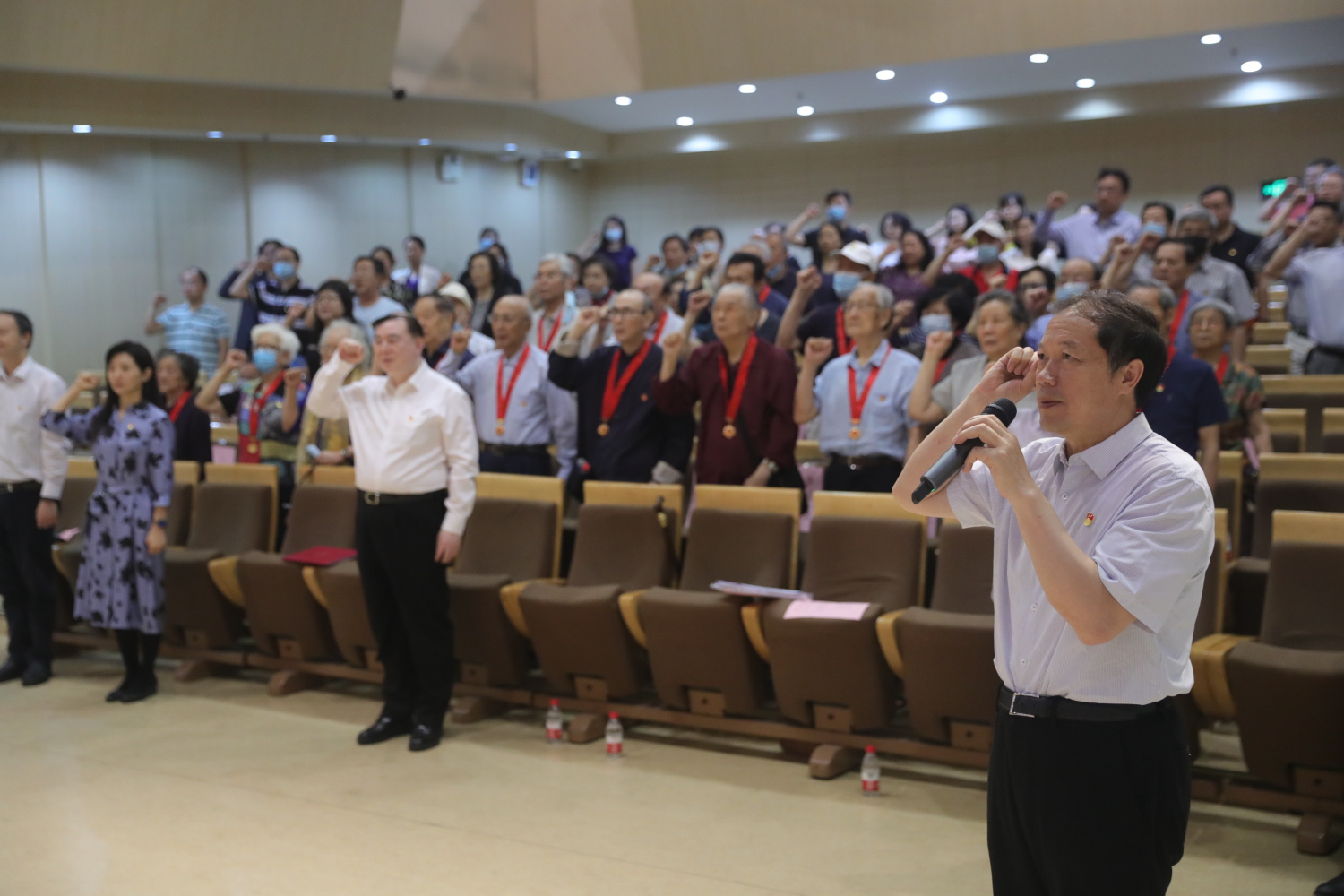 全体校领导向出席现场的老党员颁发“光荣在党50年”纪念章,并与他们亲切握手,致以真挚慰问,表达对老党员的崇高敬意。