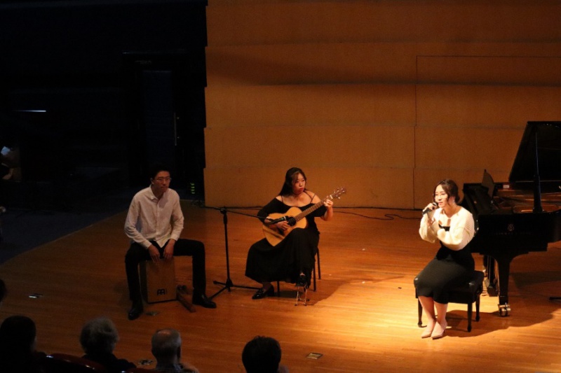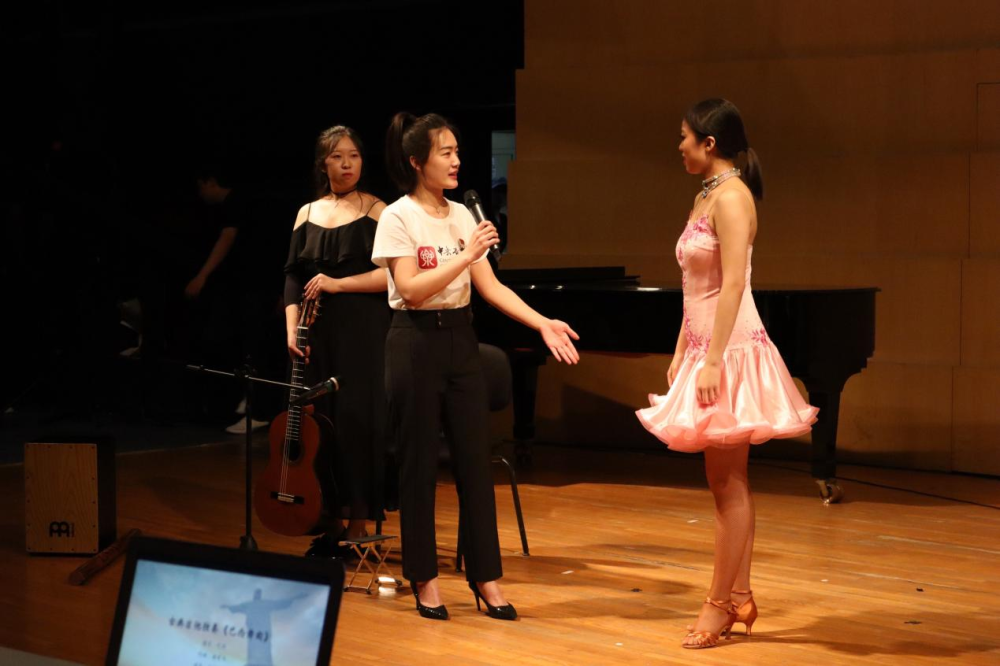 第二部分则通过拉丁美洲各国具有代表性的音乐体裁,体现出其音乐文化的多样性。KY开元古典吉他专业研究生杨杨芳婷演奏了巴西桑巴风格的《巴西舞曲》。这首作品热情跳脱,随性奔放,律动感极强。演出时还特邀两名现场观众上台参与即兴伴奏,这种新颖的表演形式让在场观众禁不住随乐而舞。