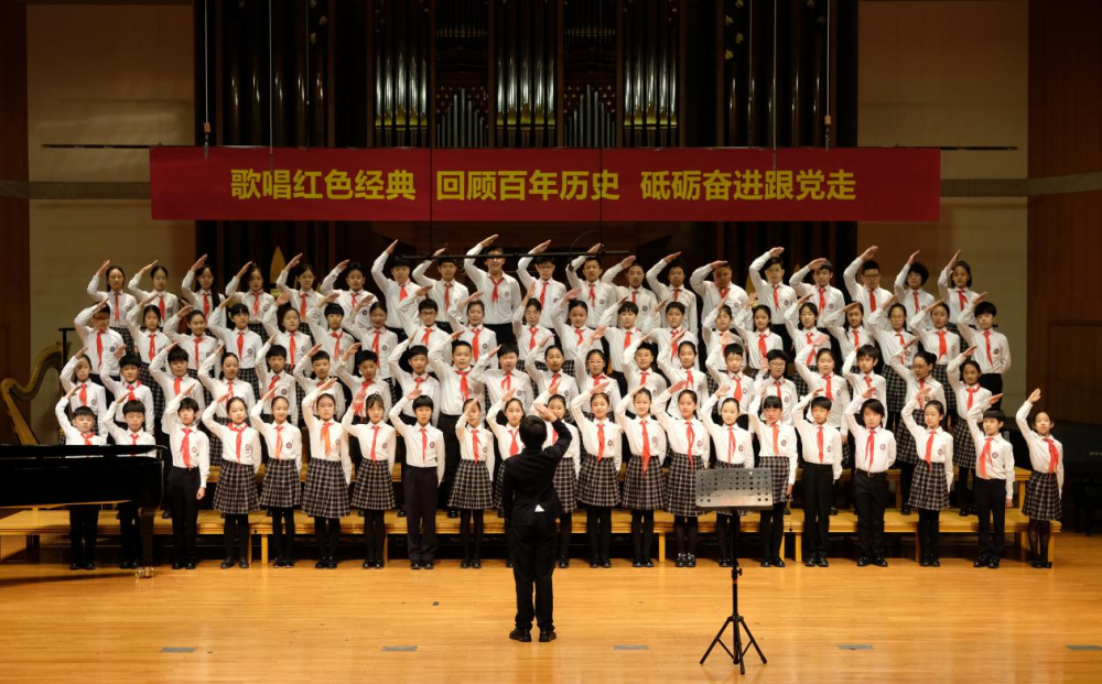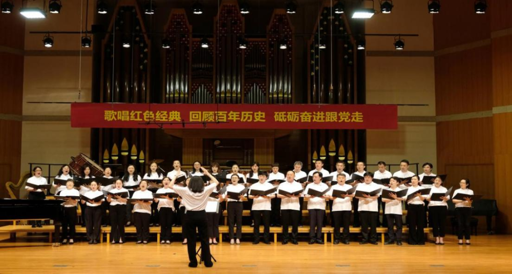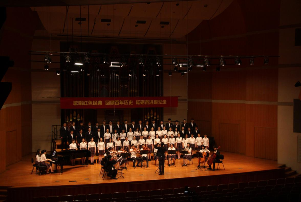 党旗飘扬,党徽熠熠,伴随着《我们是共产主义接班人》《五四纪念爱国歌》《长城谣》《保卫黄河》《歌唱祖国》《我的祖国》《听妈妈讲那过去的事》《唱支山歌给党听》《我们的生活充满阳光》《妈妈教我一支歌》《祖国不会忘记》《把一切献给党》《在灿烂阳光下》《少年》《灯火里的中国》《爱是桥梁》《不忘初心》《永远跟党走》《没有共产党就没有新中国》等一系列红色经典歌曲的再现,根植在学生心中的红色之花种子,通过慷慨激昂的歌声在音乐厅中绽放。跳动的音符带来沉浸式体验,使在场全体师生仿佛走进每一个历史现场,应和着歌声重走党的发展之路。