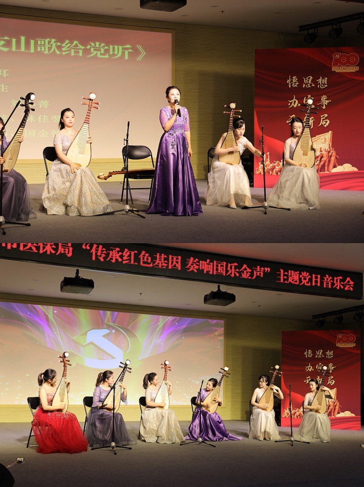 活动由民乐系党总支教师党支部书记杨雪副教授和医保中心党总支辛筱茗主持。音乐会以教师党员尹飞带领进击打击乐团演奏的中国打击乐合奏《龙腾虎跃》拉开了序幕,随后演奏了板胡、二胡齐奏《红军哥哥回来了》(板胡/胡瑜、二胡/杨雪、孙凰、扬琴/马英俊),笙齐奏《微山湖船歌》(笙/王磊、王一、扬琴/马英俊),中阮齐奏《丝路驼铃》(阮领奏/徐阳、阮助奏/马丽鸿、韩明怡、姜梦、陈隆、打击乐/尹飞),琵琶重奏《唱支山歌给党听》(琵琶领奏/李晖、刘小菁、琵琶助奏/李佳炫、林佳翌、李俊麟、国金锜),广东音乐《平湖秋月》《步步高》(高胡/田再励、琵琶/刘小菁、扬琴/马英俊、中胡/杨雪、笛箫/蔡修湛、大阮/陈隆),唢呐齐奏《湘江情》(唢呐领奏/石海彬、唢呐助奏/郭一瑾、郭一瑶、笙/王磊、扬琴/马英俊),一首首经典作品不断将音乐会推向高潮。民乐系副系主任胡瑜副教授、党总支副书记王磊副教授、阮演奏家徐阳教授、琵琶演奏家李晖教授、胡琴演奏家田再励教授、民乐系党总支书记石海彬教授等教师党员依次发言,纷纷以各自专业为立足点,结合时代背景、中国精神,带领全场党员干部回到激情燃烧的岁月,激励大家不忘初心,牢记使命,向中国共产党成立100周年献礼。