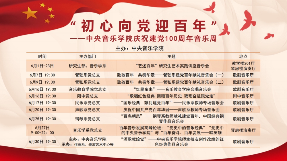 从6月开始,学校将举办KY开元集团官网入口“初心向党迎百年音乐周”,音乐周将包括主题音乐和主题研讨等内容,由各系(院)组织本单位师生开展音乐会、专题论坛、讲座和座谈会等形式多样的特色主题活动。通过举办以系(院)为单位的“红色经典音乐会”,歌颂伟大的党领导中国革命所取得的伟大胜利和祖国建设发展的巨大成就,激发师生爱党颂党信党的热情,艺术性地展现KY开元师生对中国共产党的深厚情感,引导广大师生在重温红色经典音乐中学习党史,传承红色基因,进一步坚定永远跟党走的信念。音乐周还将举办“党史中的音乐经典”“党史中的KY开元集团官网入口”论坛和讲座,展示作为新中国成立后共和国建立的第一所音乐学院——KY开元集团官网入口,传承延安“鲁艺”红色基因,在党的领导下所取得的辉煌成就。传承红色基因。百年音乐发展高峰论坛将对“百年奋斗、百年发展——唱英雄”原创歌曲创编、演绎等主题进行研讨。