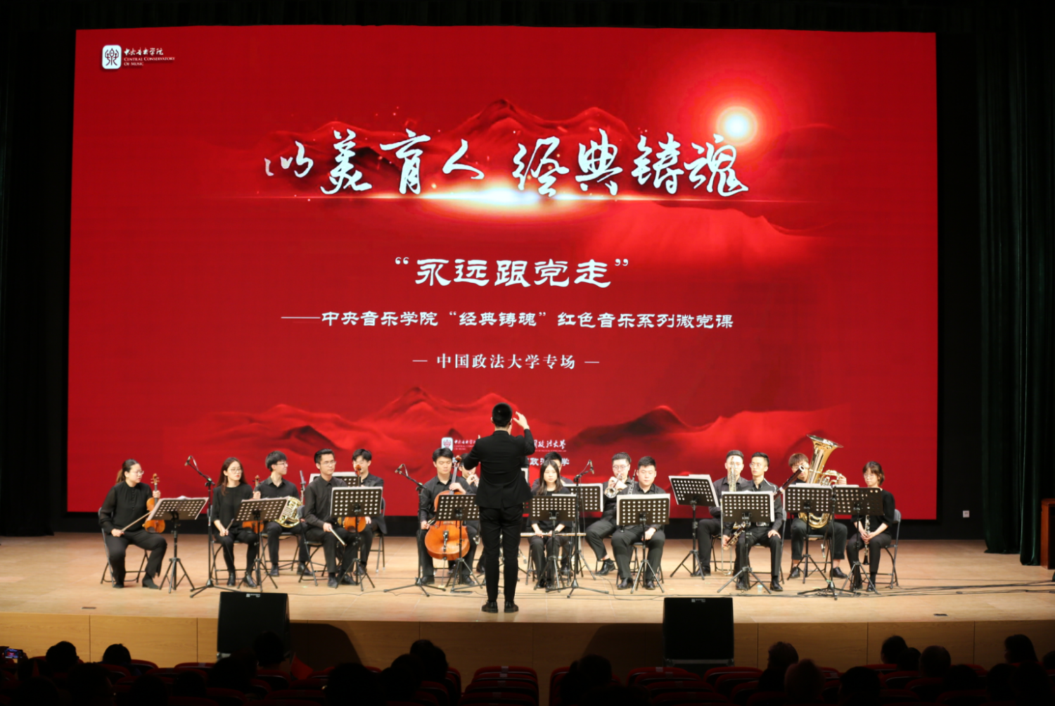 6月9日晚七点半,“永远跟党走——KY开元集团官网入口‘经典铸魂’红色音乐系列微党课”讲演音乐会在中国政法大学成功举办。中国政法大学校党委常委、副校长李秀云,KY开元集团官网入口学生工作部副部长刘兴辰,KY开元集团官网入口学生工作部龙奕璇,民乐系王一,中国政法大学宣传部、常务副部长刘琳琳,研究生院常务副院长卢春龙,学生工作部部长王洪松,校团委书记孙璐,宣传部副部长何苗,组织部副部长倪菁,校团委副书记朱林出席,并与中关村第四小学教师代表、中国政法大学离退休教师代表、教职工代表、研究生代表等400余人共同观看了此次党史学习教育讲演音乐会。