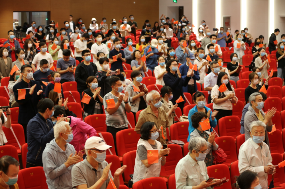 音乐会结尾,当《歌唱祖国》的旋律响起,老中青三代观众齐声高唱“五星红旗迎风飘扬,胜利歌声多么响亮……”,现场红旗飘扬、歌声嘹亮,让人热血沸腾、热泪盈眶。