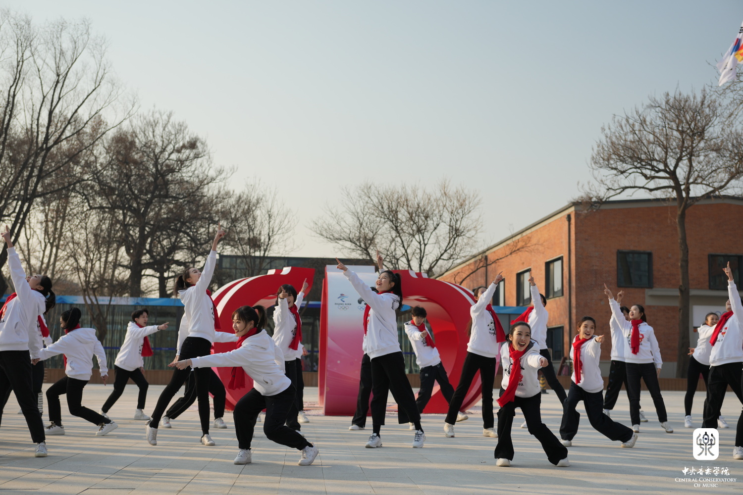 环绕着北京冬奥村休战壁画舞蹈的学生们