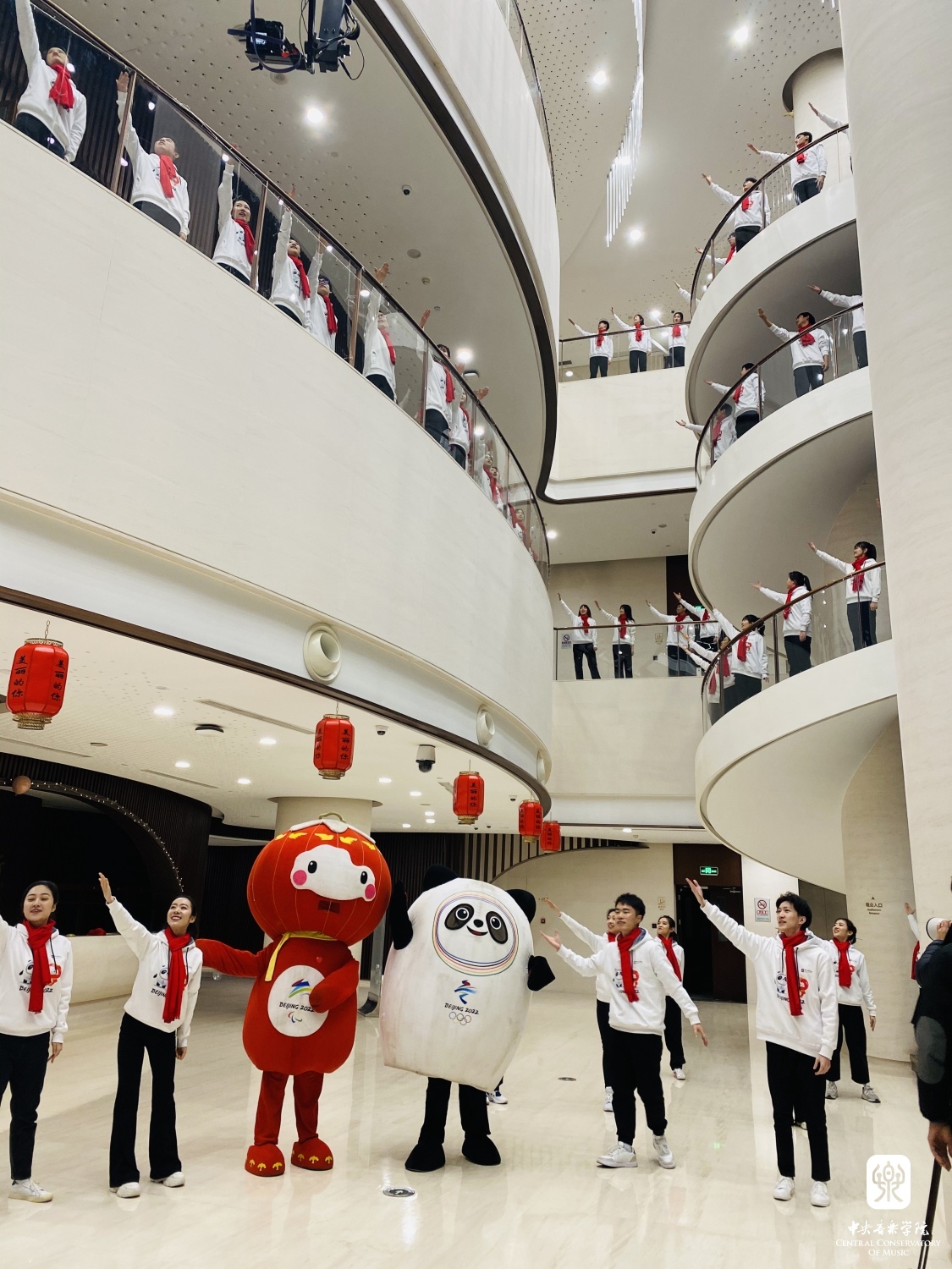 央音歌剧大厅里冰墩墩和雪容融与学生们共舞