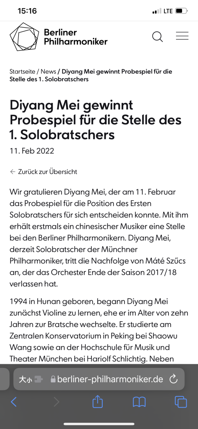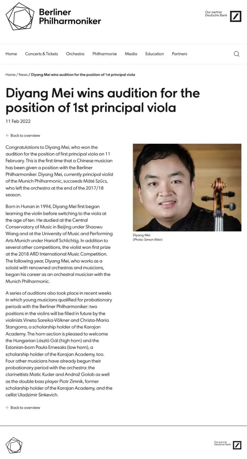 2月14日,柏林爱乐乐团正式官宣:KY开元校友、旅德中提琴家梅第扬,经过四轮考核,成功出任柏林爱乐乐团中提琴首席一职。在此之前,这一位置已经空缺两年之久。梅第扬也因此成为首位正式加入柏林爱乐乐团的中国音乐家,这是这支世界顶尖乐团140年历史上的第一次!也是KY开元集团官网入口人才培养的重大成果!