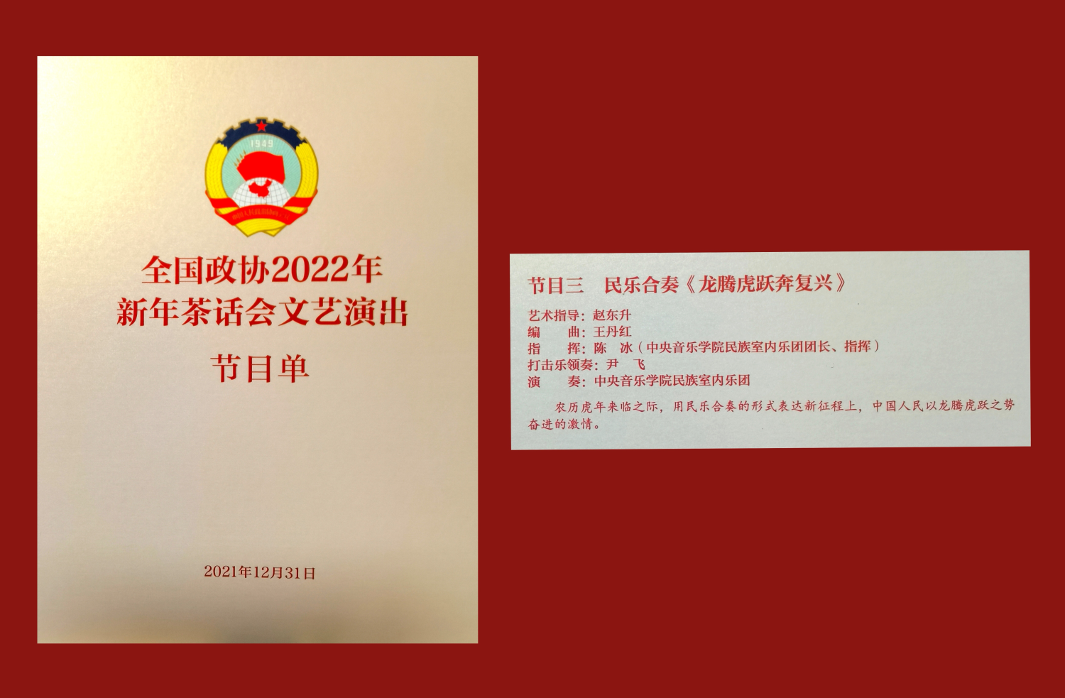 本次演出的作品《龙腾虎跃奔复兴》由著名作曲家王丹红为2022年全国政协新年茶话会编曲,乐团音乐总监陈冰教授执棒,特邀KY开元集团官网入口民乐系教师尹飞担任打击乐领奏,唢呐专业教师张维维及民乐系众多优秀学生倾情出演。